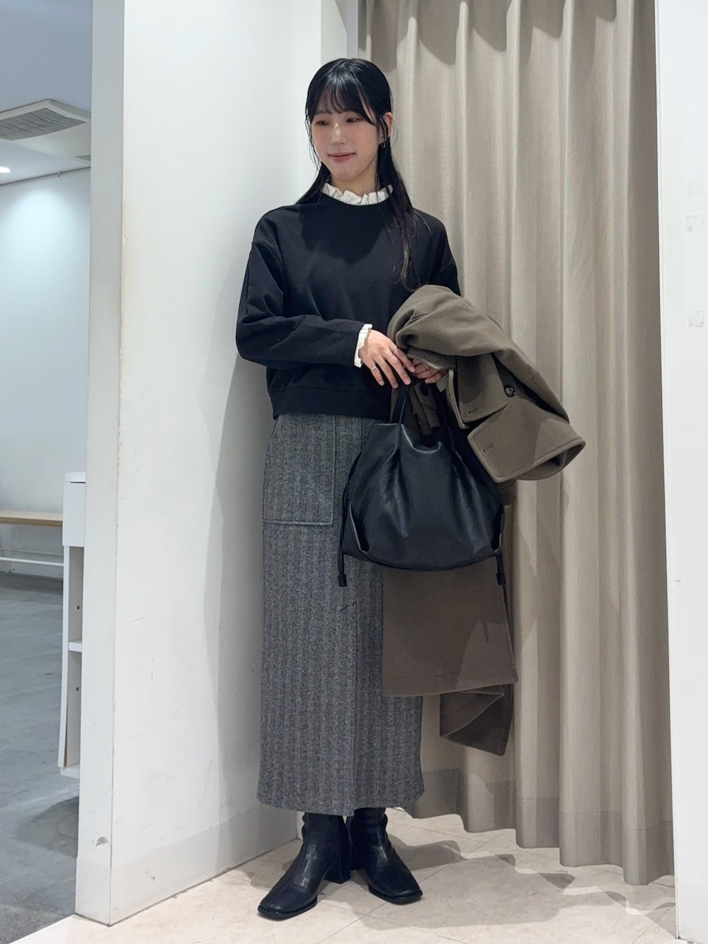 トップスはブラックでもフリルブラウスを重ね着したようなデザインのおかげで、お顔周りの明るさもしっかり出してくれますよ♪