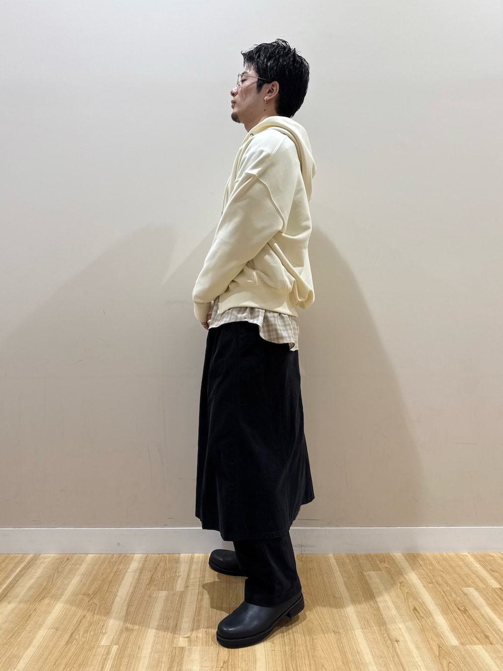 パッと見は白と黒。って感じですが、今回は真っ白ではなくパーカーはオフホワイト、シャツもオフホワイトにブラウンも少しあり、若干の下半身からのフェードを意識することでバランスをとっています。