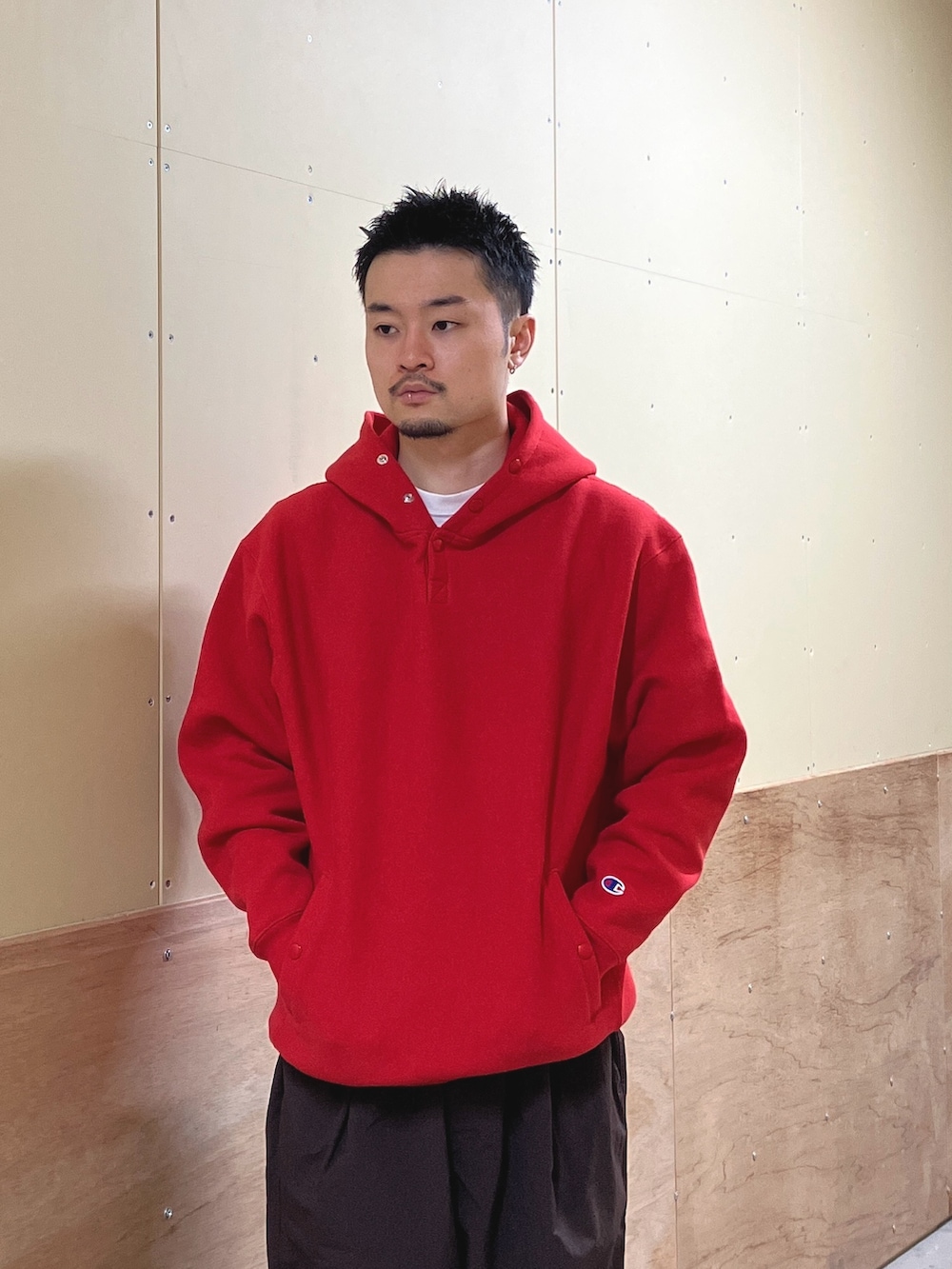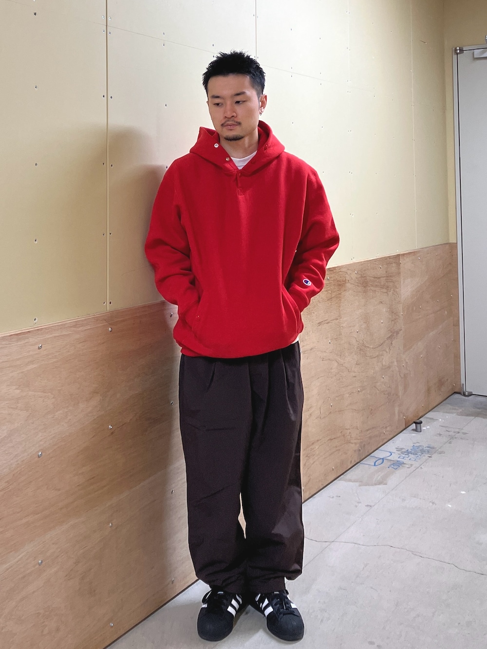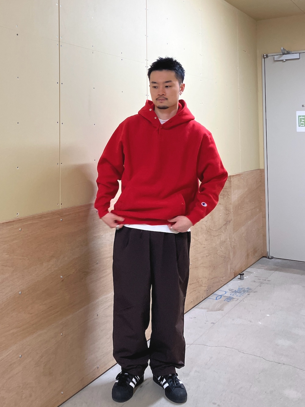 別注Champion Reverse WeaveスナップパーカーとEKALのウォームトラウザーのコーディネートです!スナップが特徴的なのと、色味がかなりバチバチでカッコいいですね😎