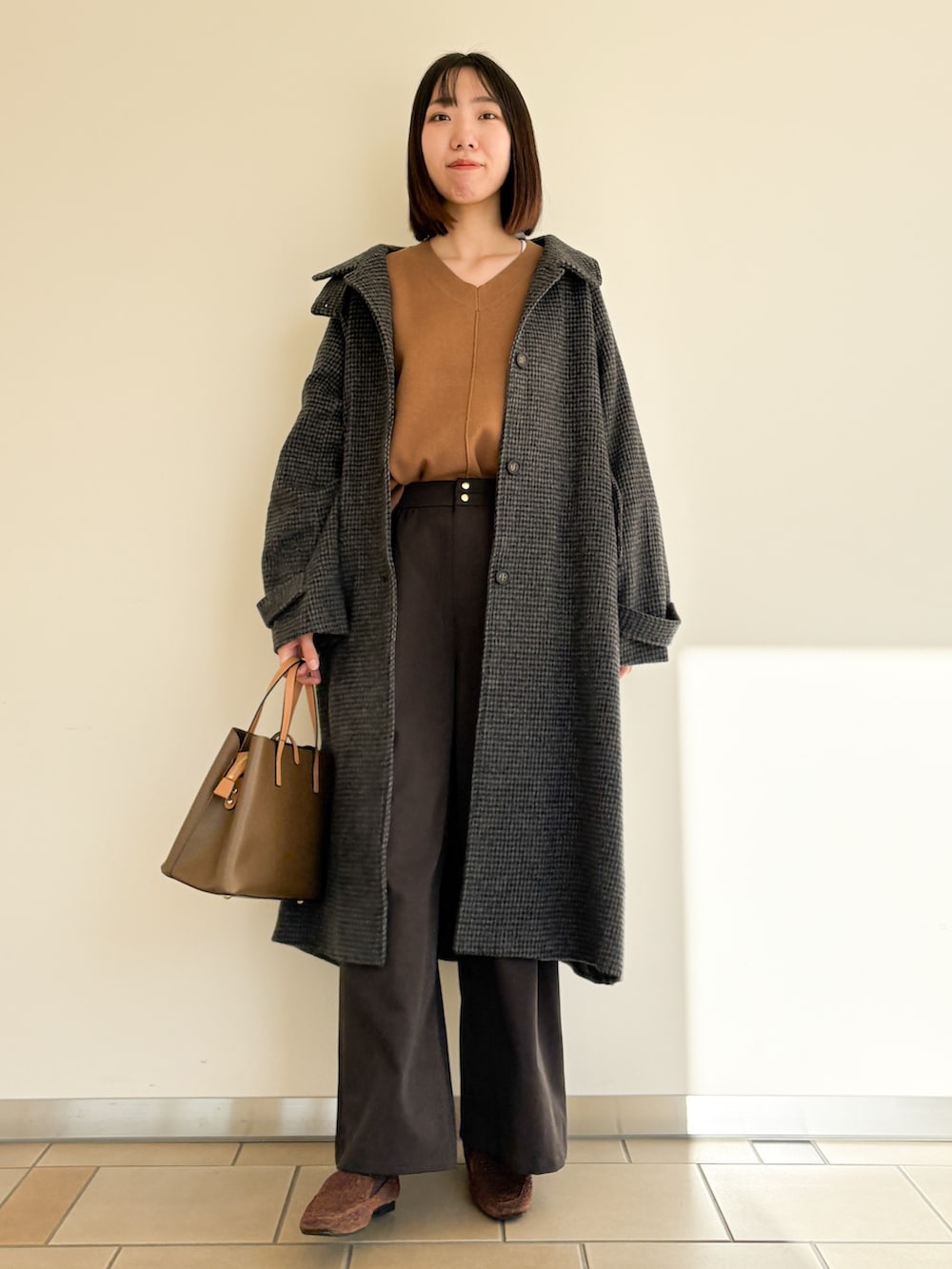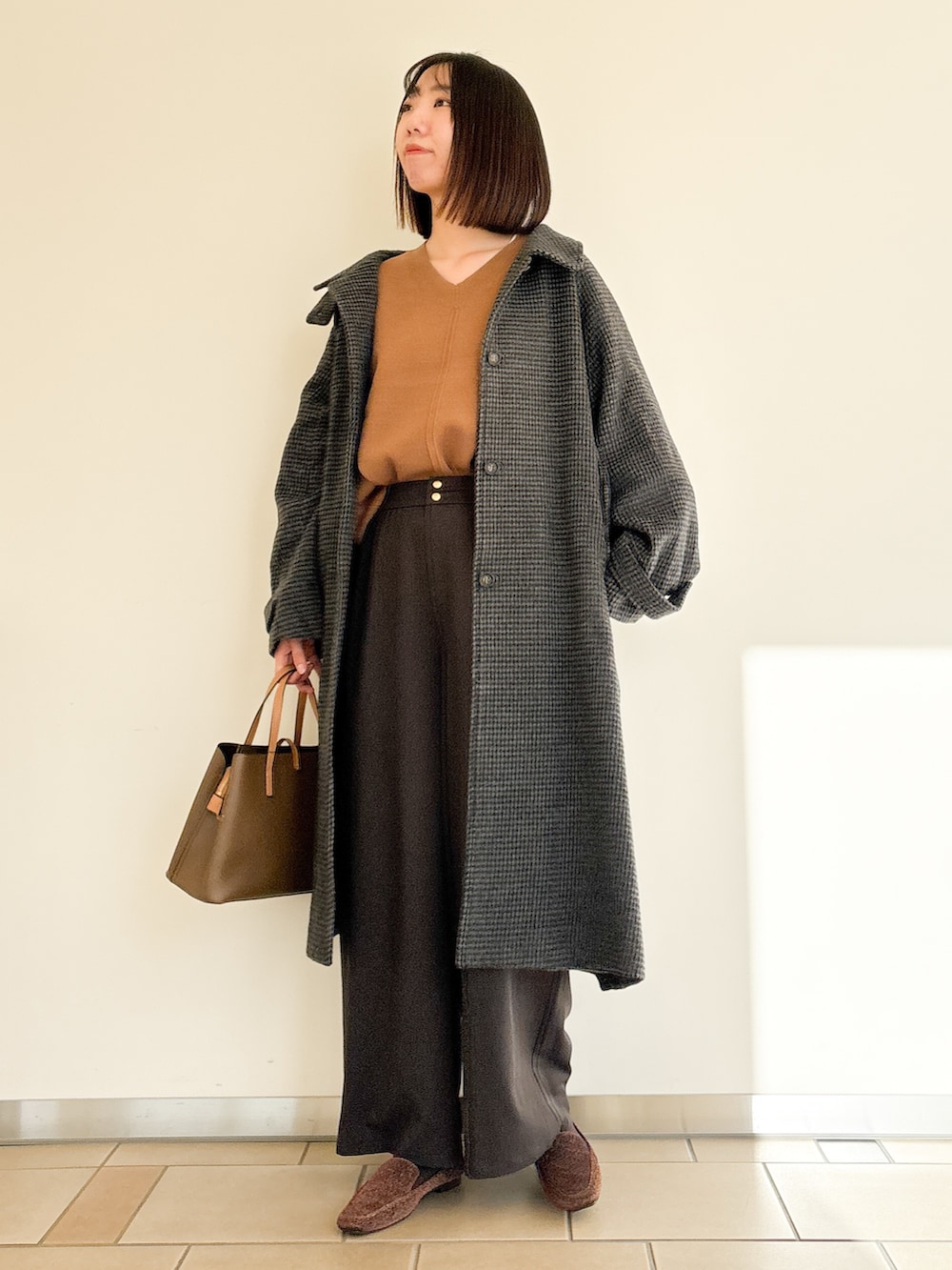 中はパンツスタイルで合わせました!ボトムの金ボタンが可愛いのでニットはタックインスタイルにしました♩