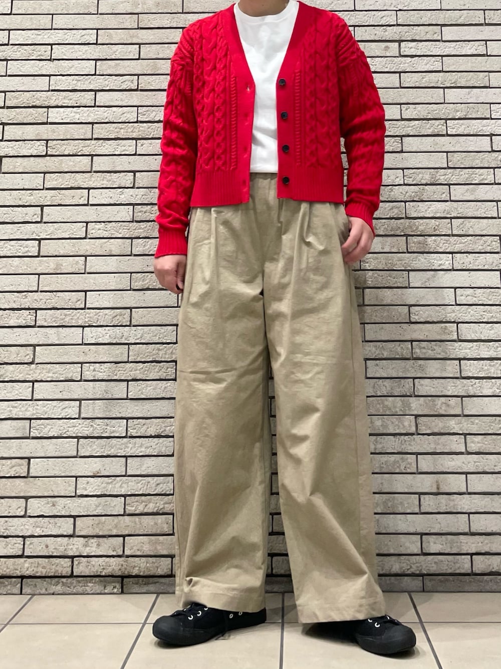 ケーブル編みが目を惹くニットカーディガンです。綿混の生地で、ざっくり編み立てられた優しい風合いの1着です。
