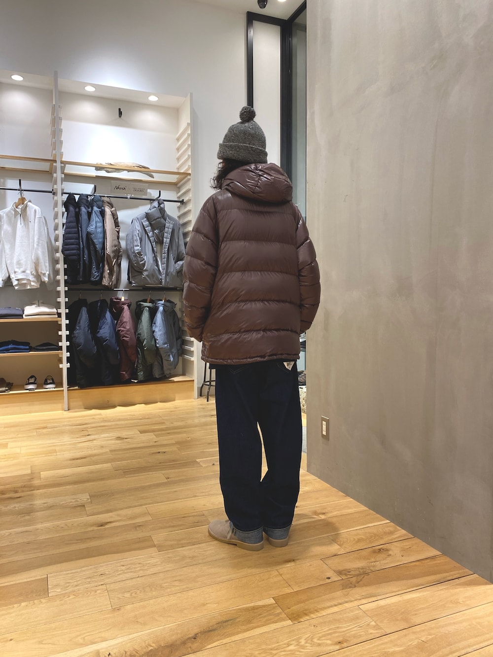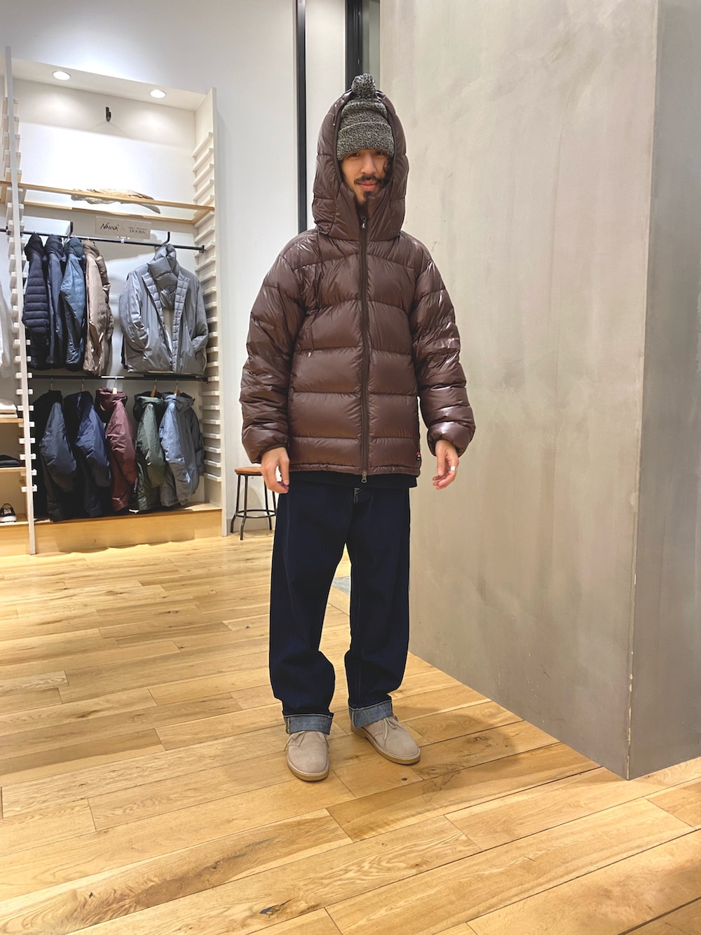 本日はEKAL×NANGA別注クラシックダウンジャケットをメインに着用しております。