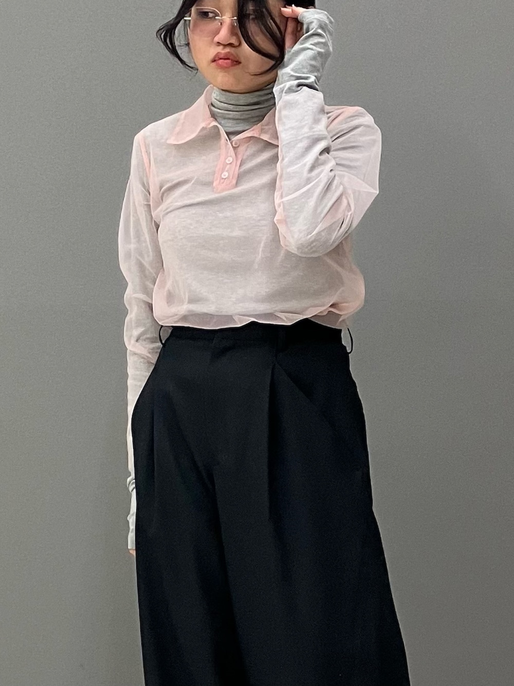 チュールレイヤードニットシャツはチュールシャツとニットシャツが各々バラバラに使えちゃうので、お手持ちのタートルネックインナーとこのように合わせられます!