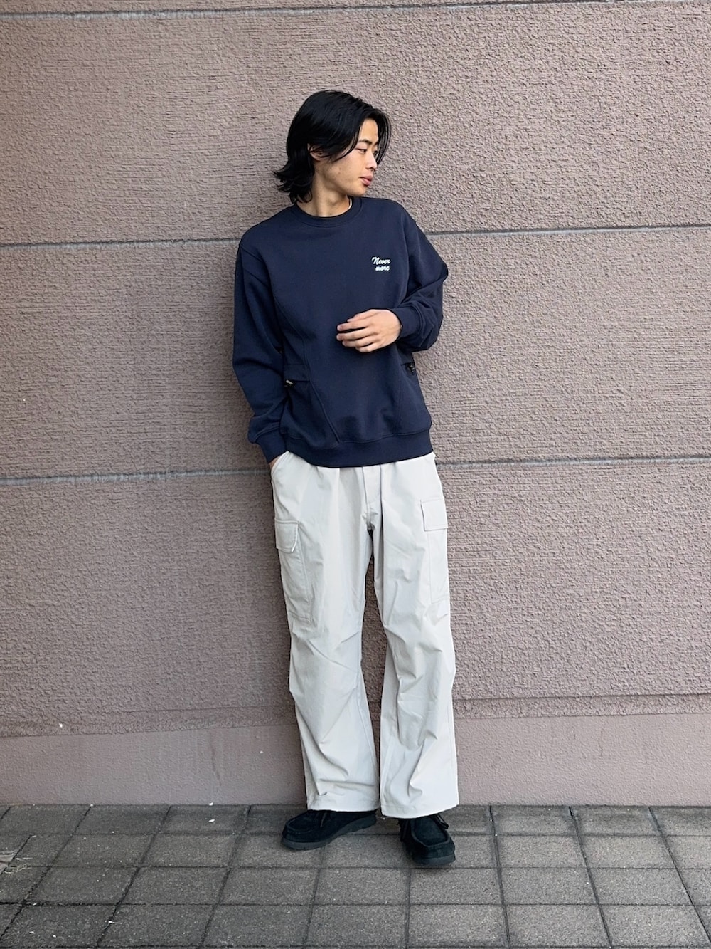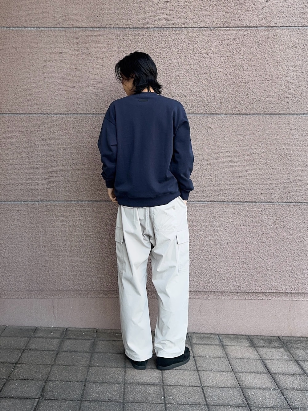 シンプルですが、少し変わった雰囲気のあるスウェットです!!カーゴパンツはウエストがゴムと紐で調節できるので楽に履いていただけます!