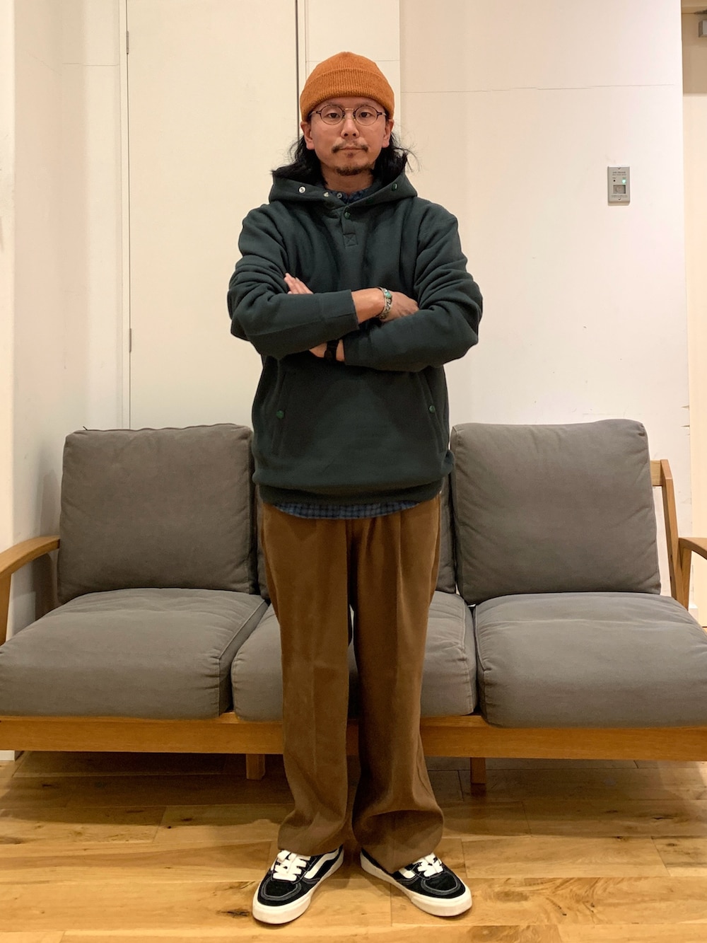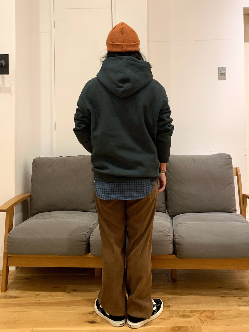 毎年大人気のチャンピオンの別注フーディーをメインに差し色を使いつつコーデしました。こちらのフーディーは程よくフードが立ってくれるのでシルエット最高です!
