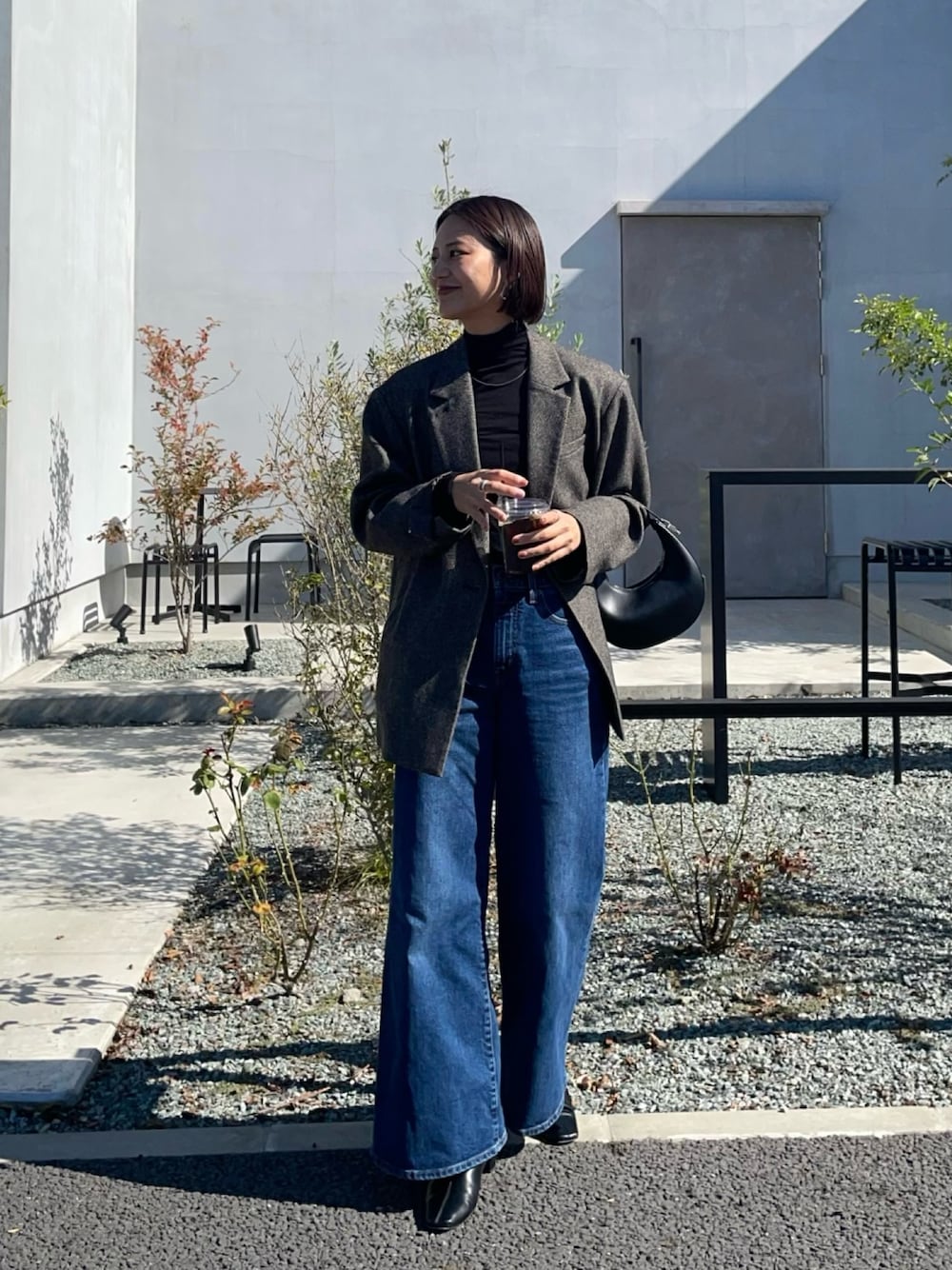 ボトムスもリアルバイしたデニムイージーワイドパンツです!ウエストがゴムなので楽ちんなのと、ワイドなシルエットが好きな方にオススメの形です!私は36のサイズでロールアップして、裾を折っているので、低身長はお直しが必要です!