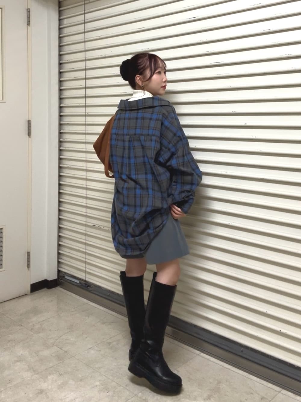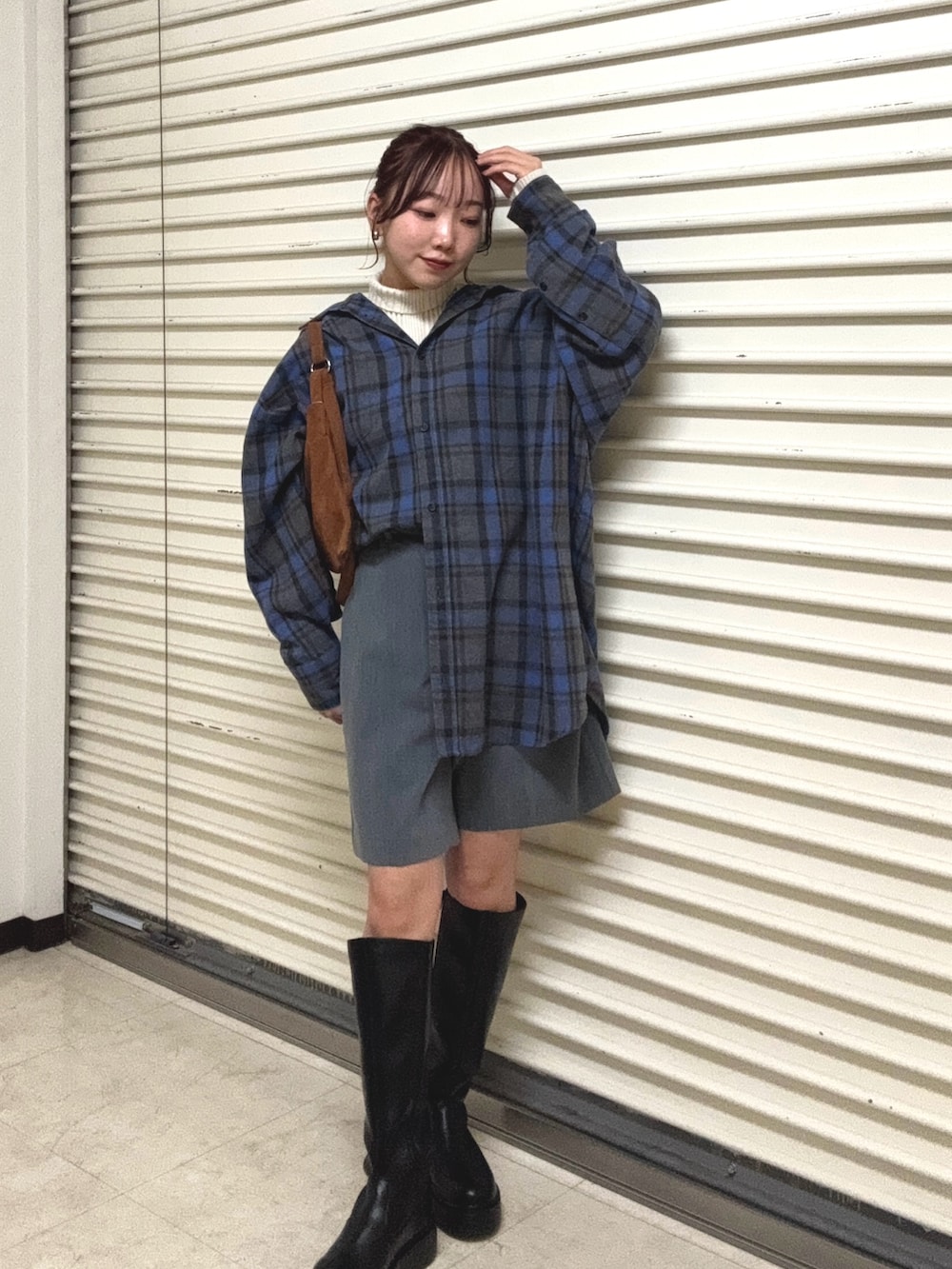 ショートパンツ×ロングブーツでバランスよく、ゆるさの中に女性らしさをプラスしました。