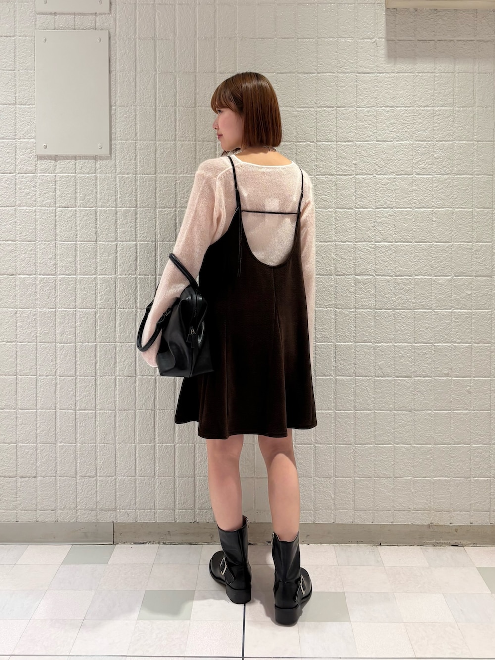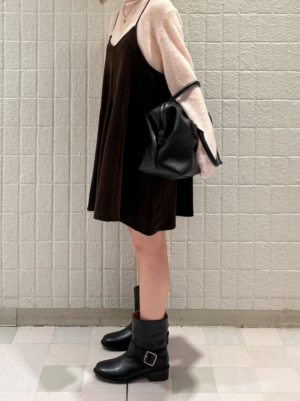 ピンクのトップス×ブラウンのキャミワンピースに靴をエンジニアブーツにして甘くなりすぎないようにコーデを組みました!