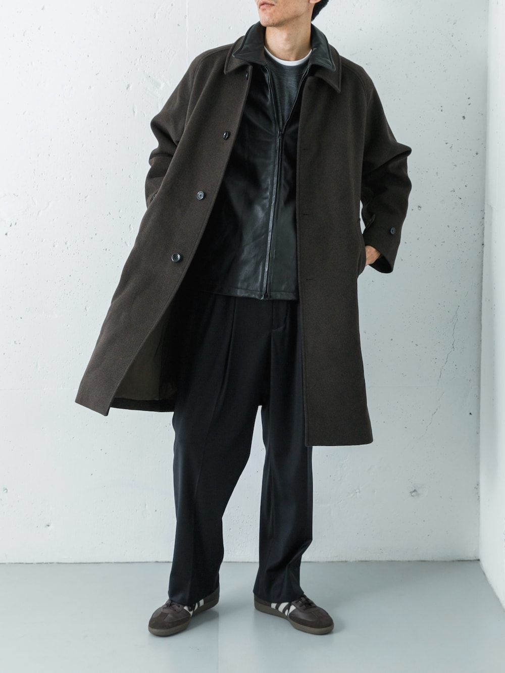 上質な素材同士の掛け合わせが奥行きを生み、足元のサンバが軽やかに全体をまとめます。