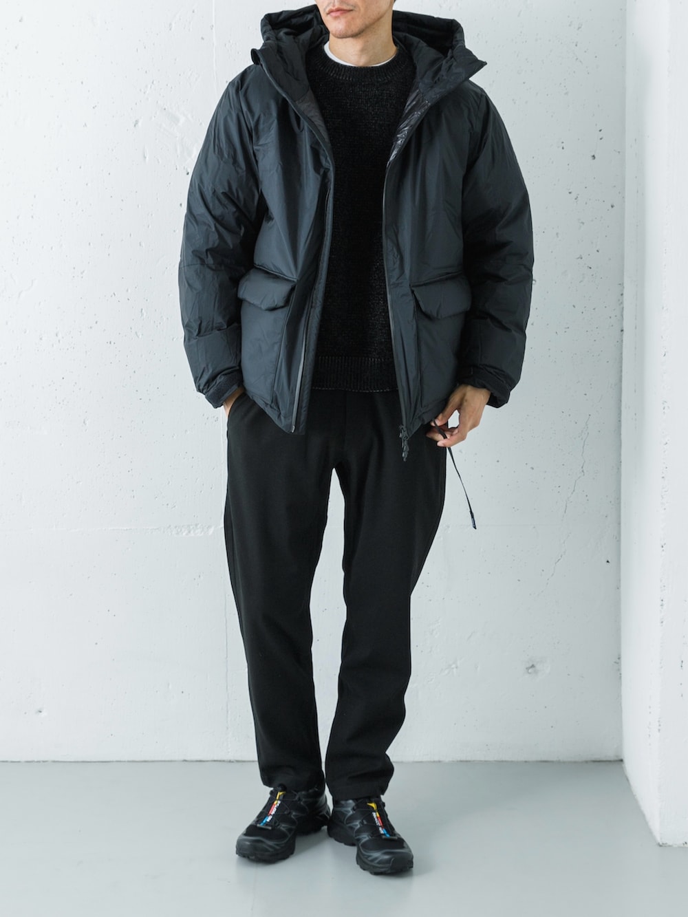 ボリュームのあるダウンとローゲージニットのコンビが季節感を際立たせ、ウールライクなパンツで品よくまとめたバランスの取れたスタイル。