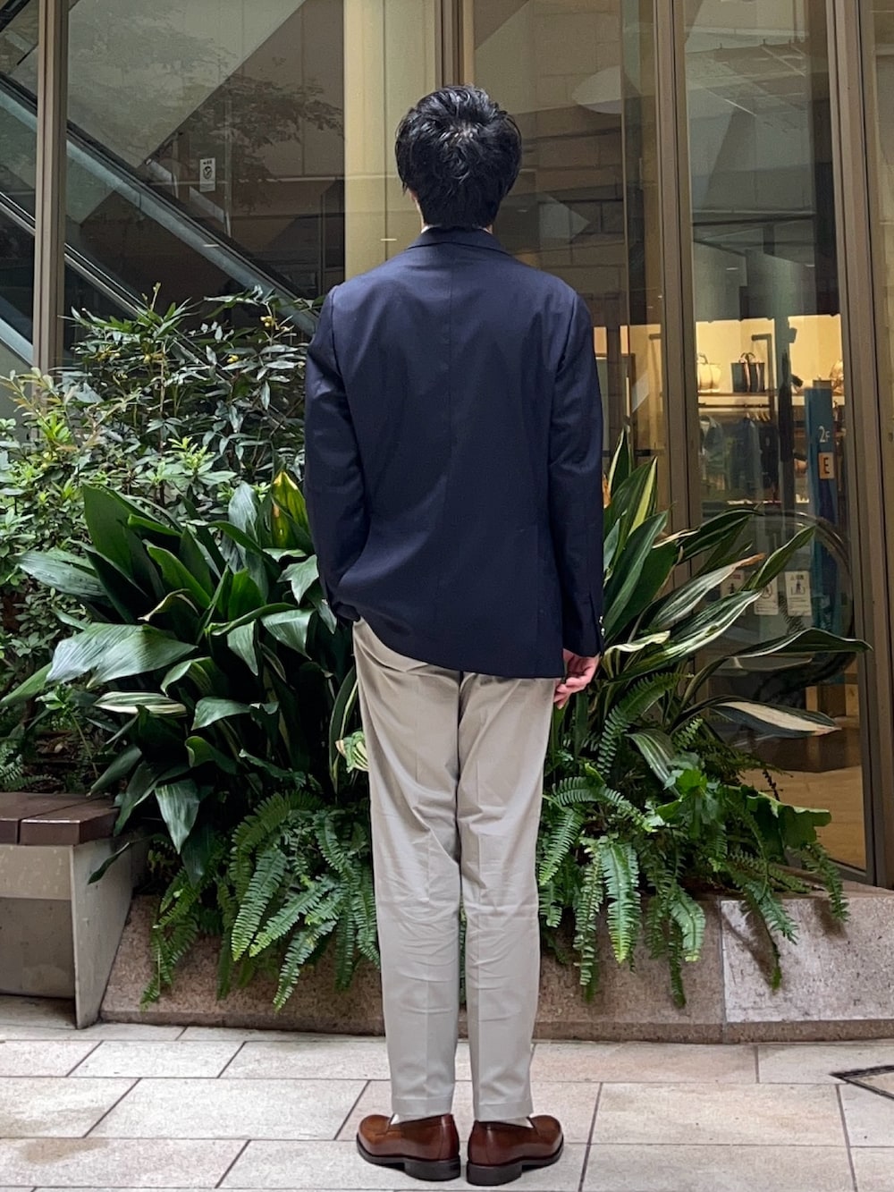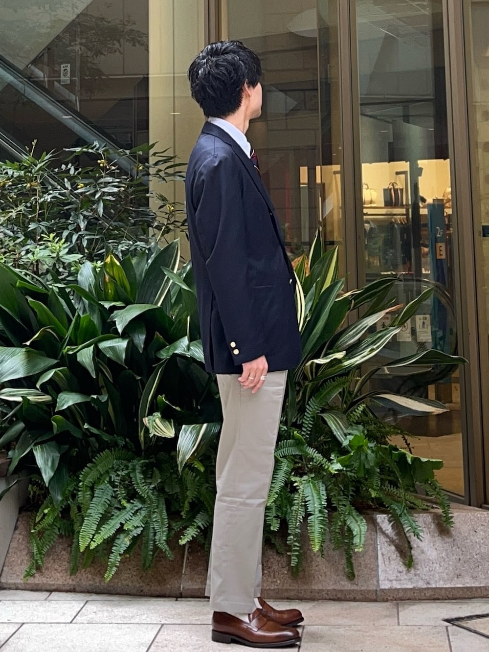 ブレザー、ストライプのオックスフォードシャツ、右下がりのアメリカ式のストライプタイ、チノパン、ローファーとアメトラの基本的なアイテムで構成しました。