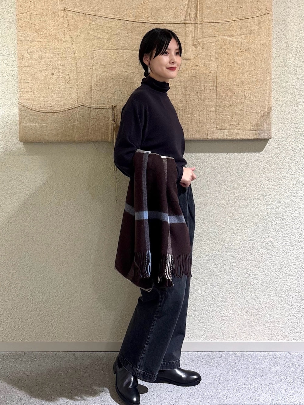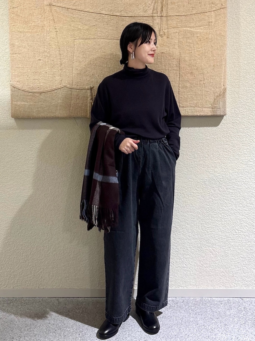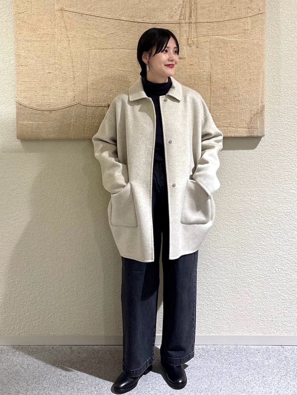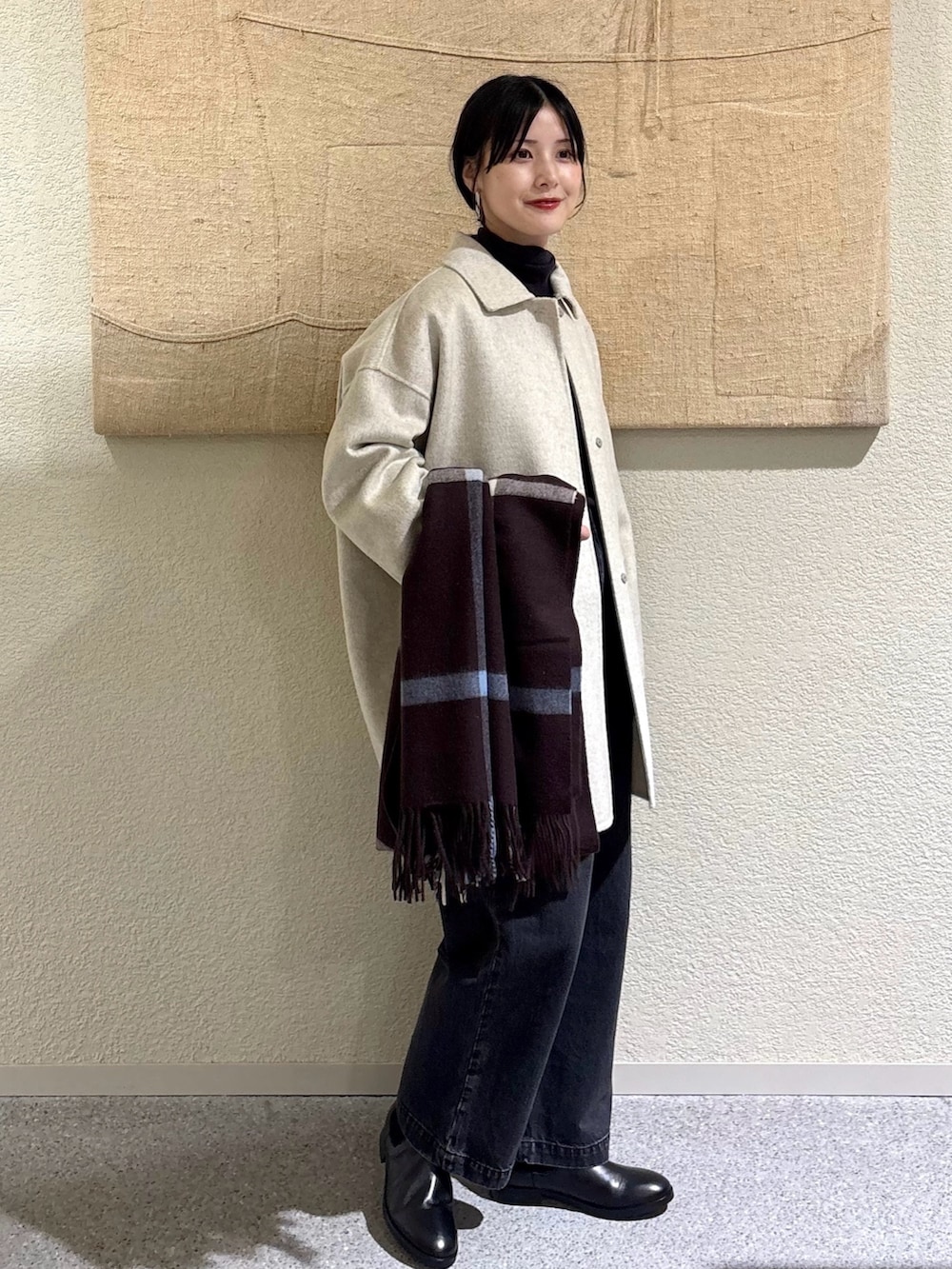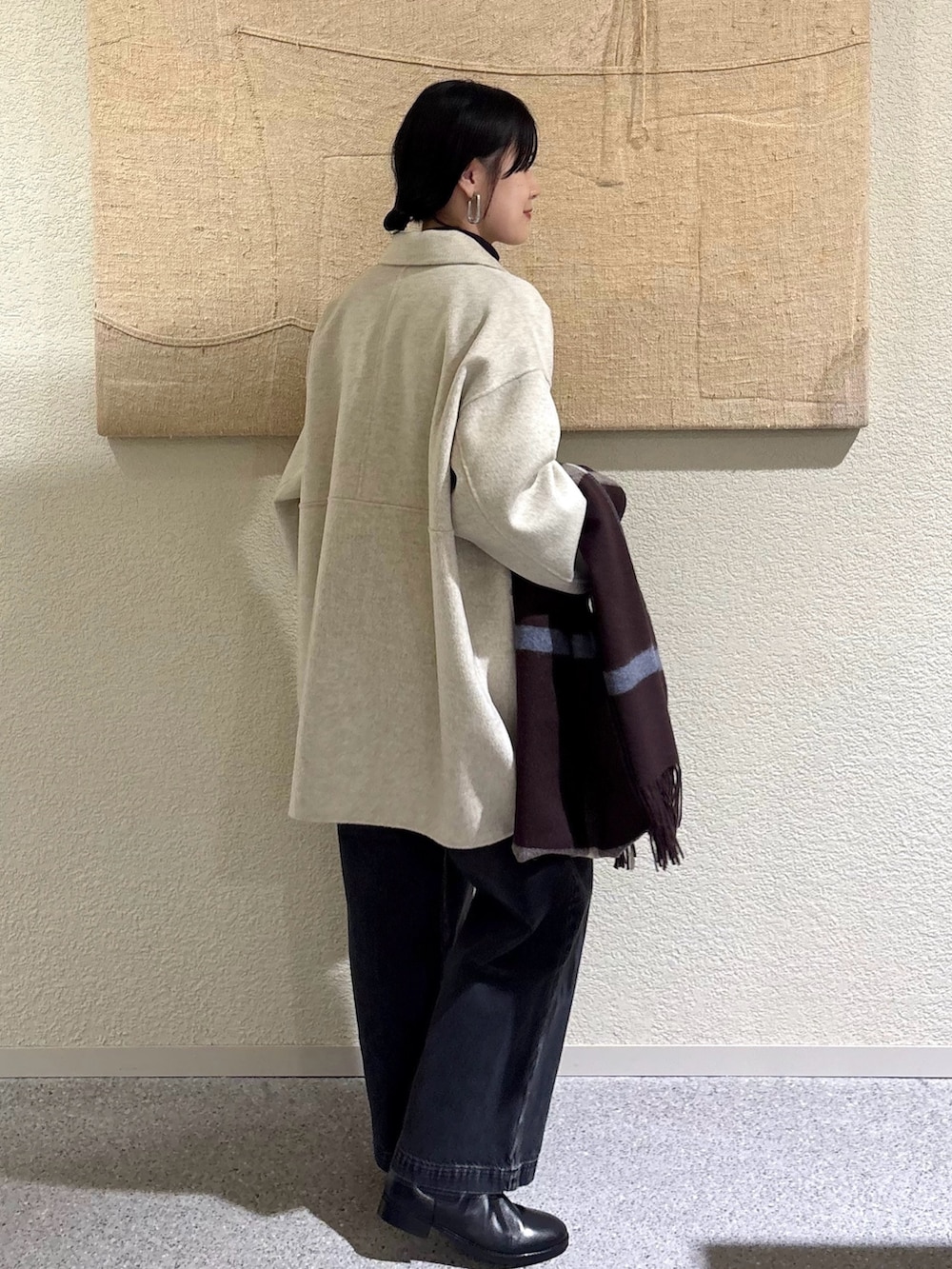 ・淡いOATMEALコートにチャコール×ブラックを合わせた、トーン控えめの大人配色。