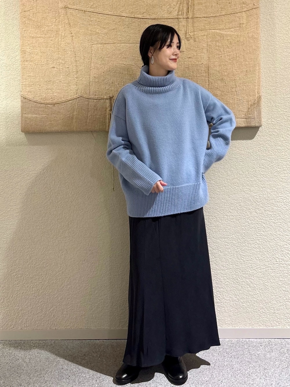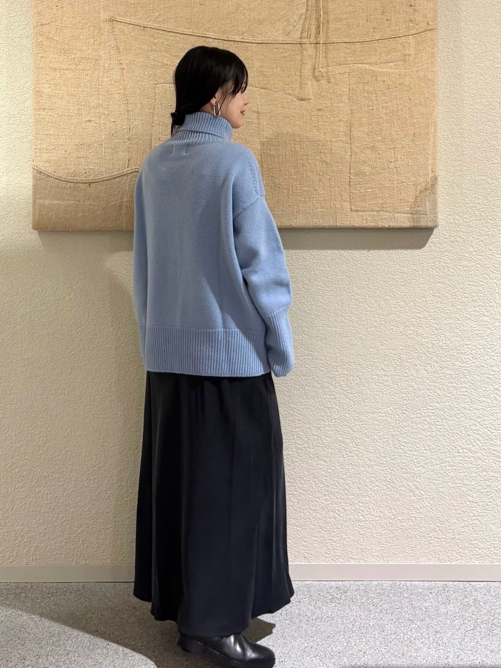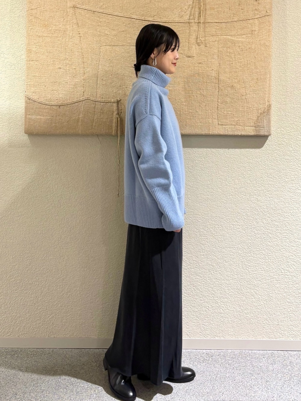 ふんわりとしたラムウール素材が心地よいニット。柔らかなライトブルーが、冬の装いに明るさと清潔感を添えます。上質な素材感とベーシックなデザインで、長く愛用できる万能な一枚です。