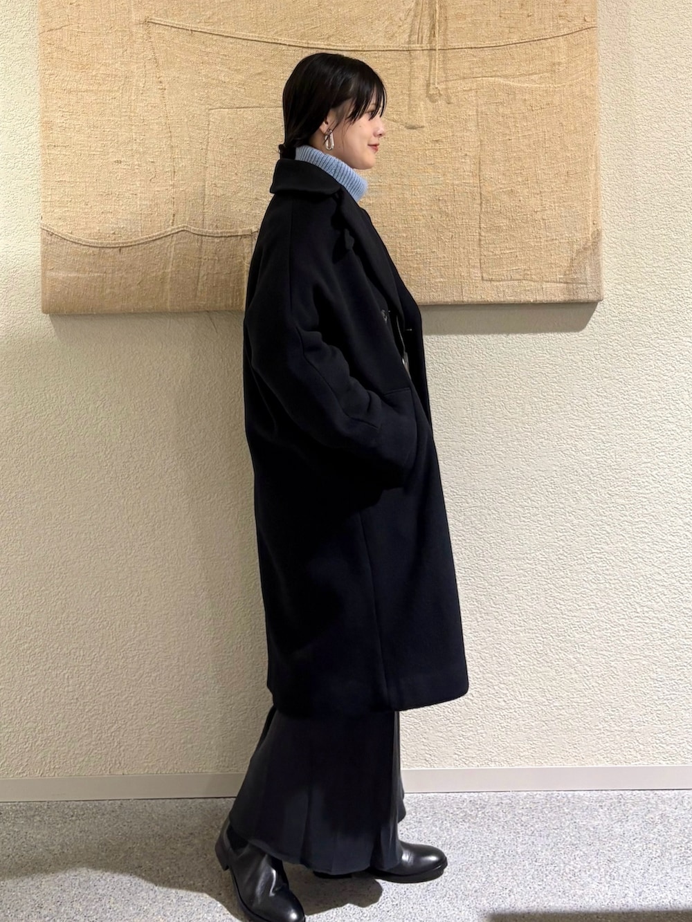 丸みを帯びた立体的なシルエットが魅力のテントコート。たっぷりとしたボリューム感がありながらも、BLACKカラーで全体を引き締め、モードな印象に。ゆったりとしたサイズ感で、厚手のニットの上からでもバランス良く羽織れます。