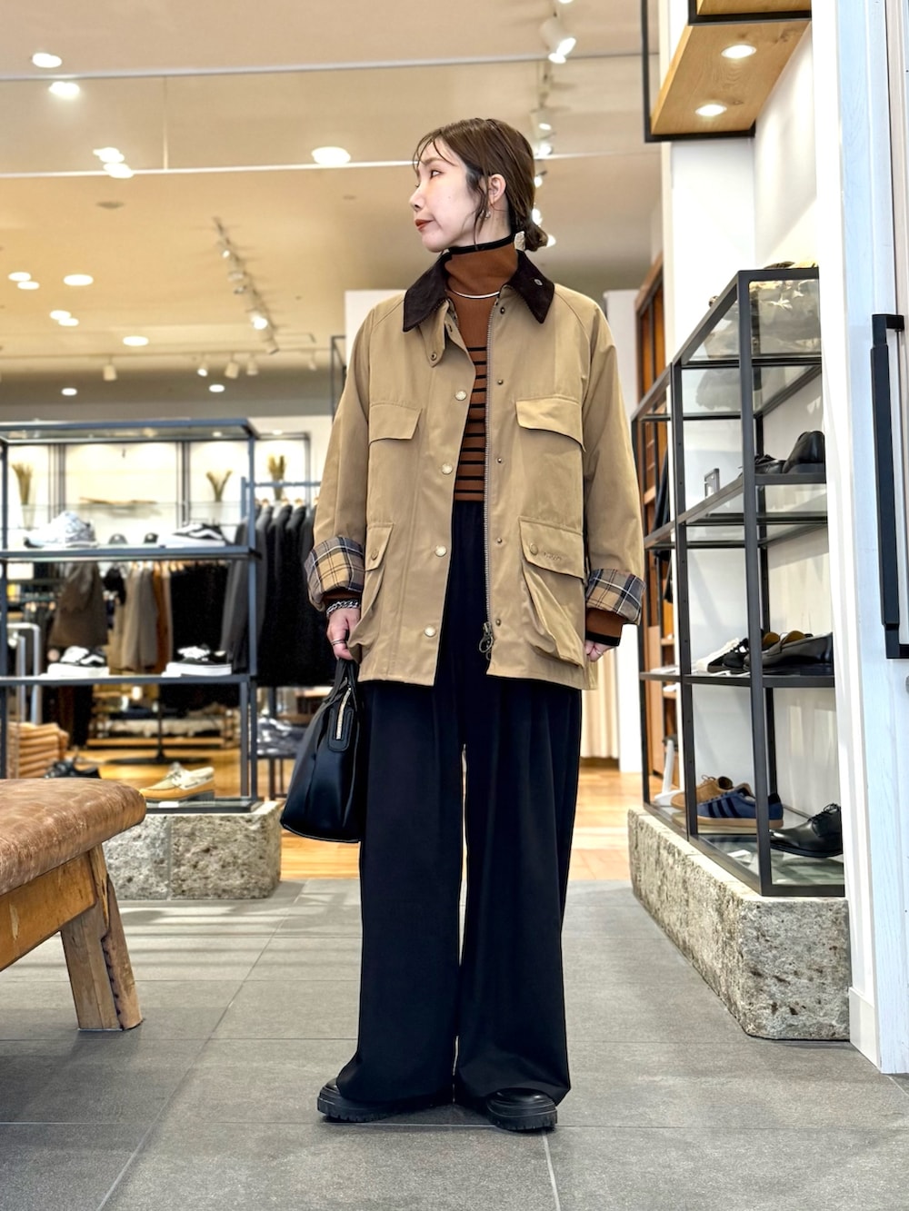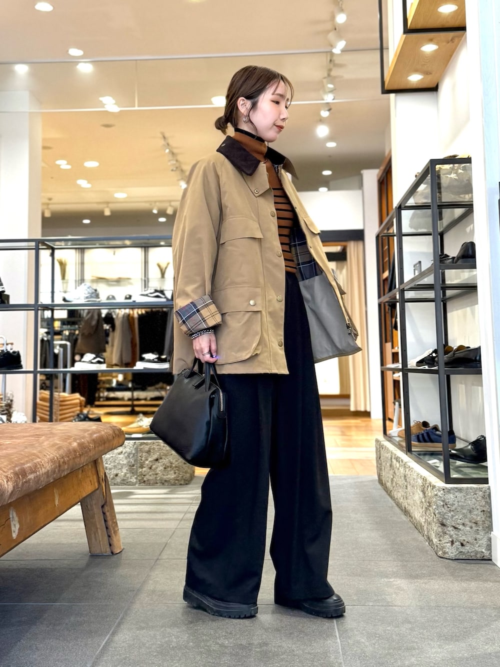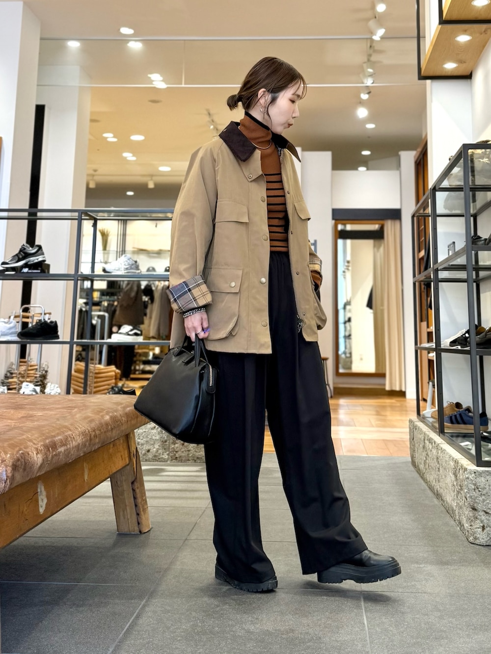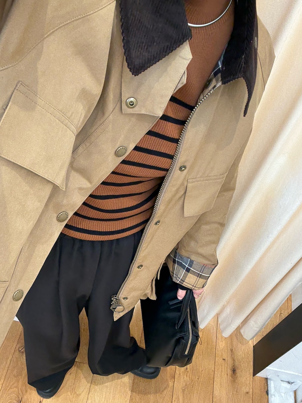 メンズライクなBarbourの別注アイテム。袖口からチェック柄が見えるのもポイント。大きめの作りで中に厚手のニットも着られるサイズ感でした◎スカートでもパンツでも合わせられます。