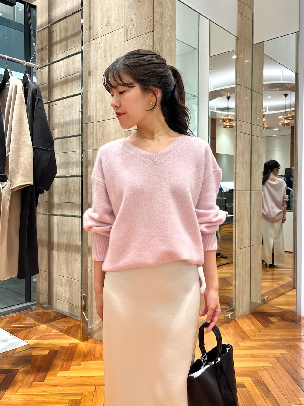 異素材のサテンスカートでメリハリのあるコーディネートに♪