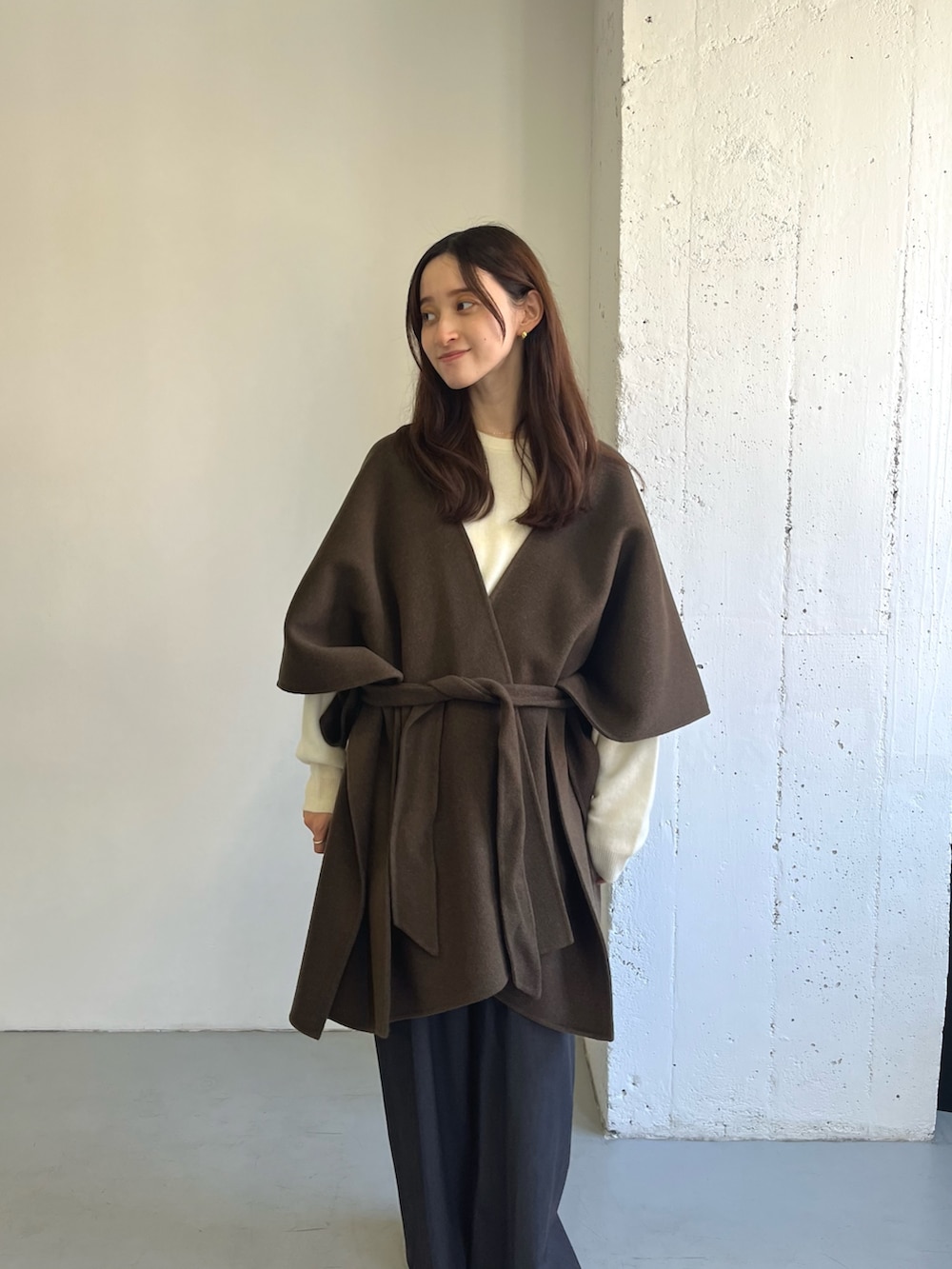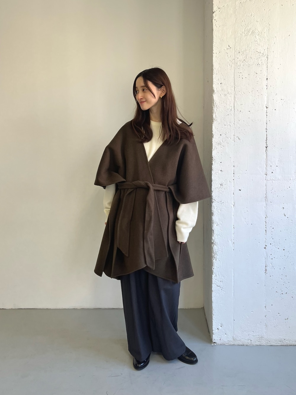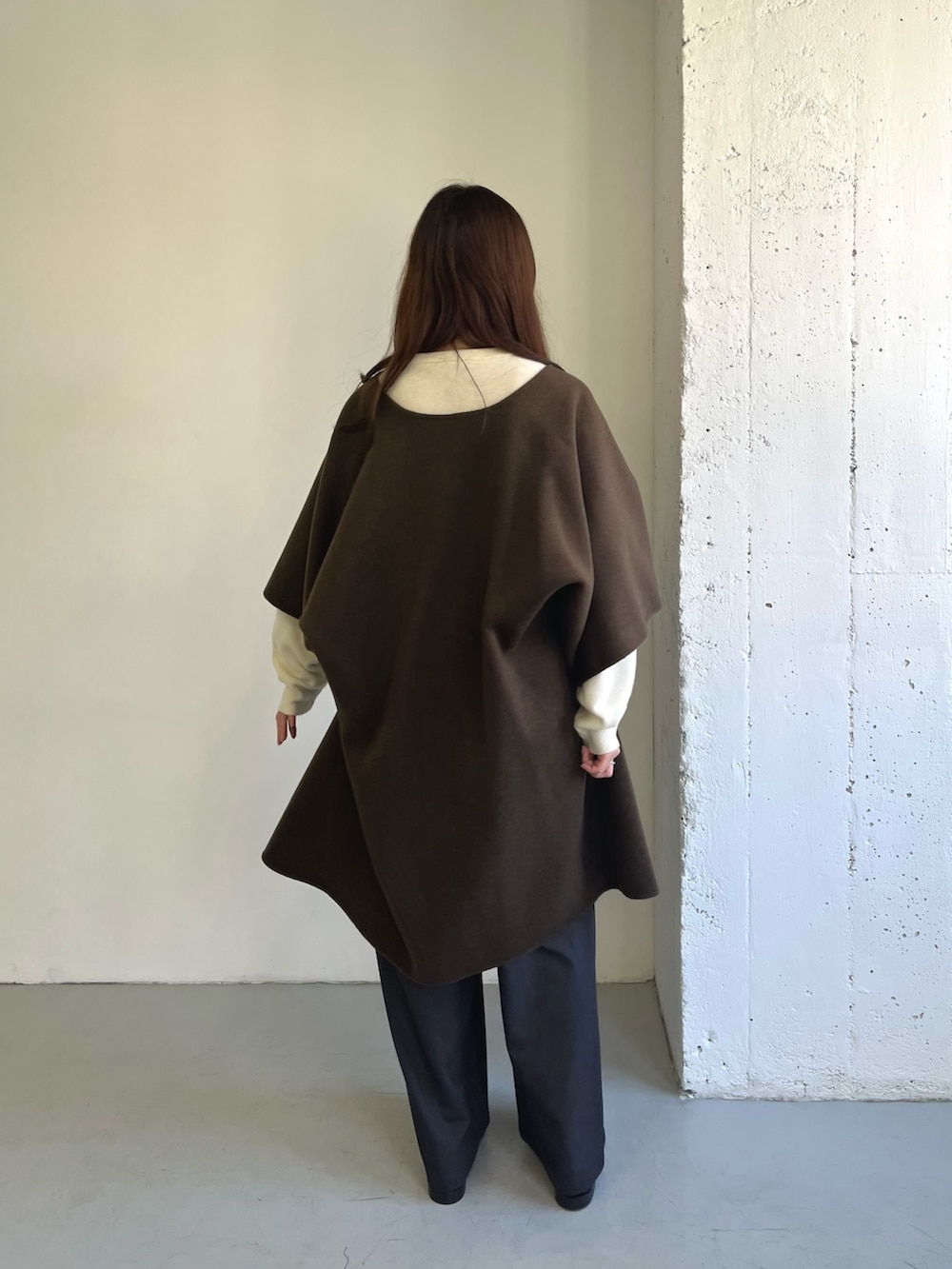 厚手のニットと合わせると暖かく、ポンチョがコーデのポイントになります◎