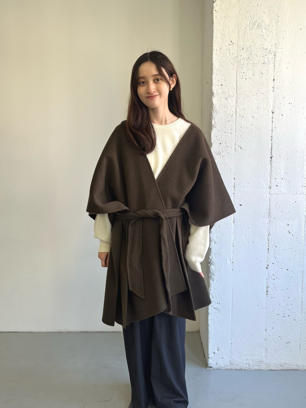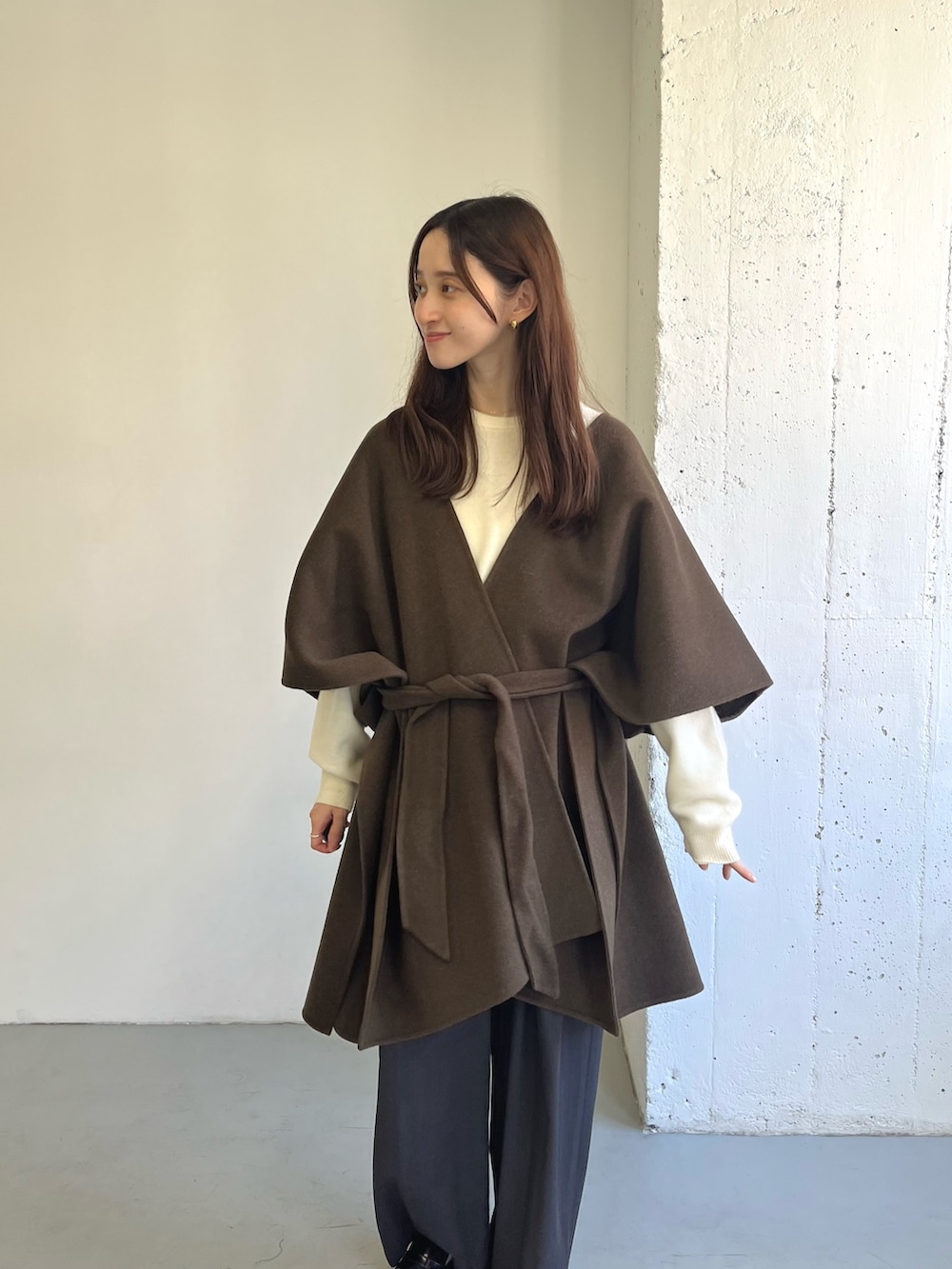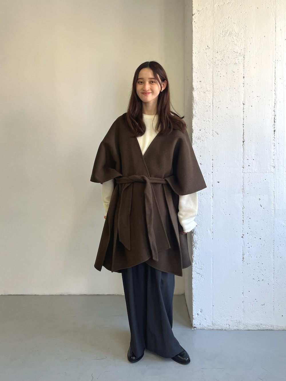 厚手のニットと合わせると暖かく、ポンチョがコーデのポイントになります◎