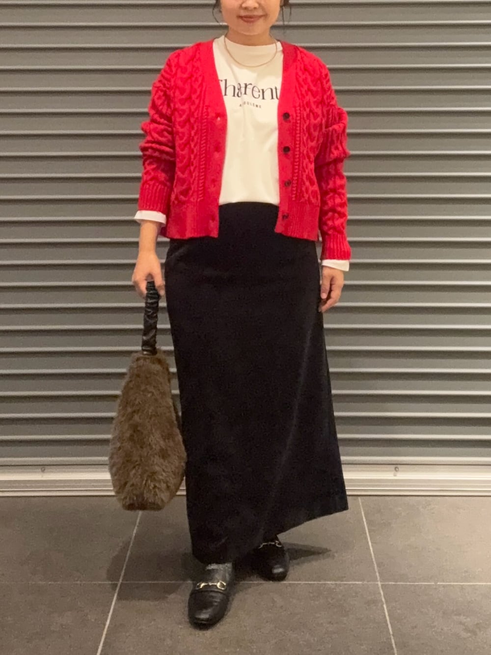 ベロアスカートにシルバーバックを合わせてシンプル大人コーデにしました。
