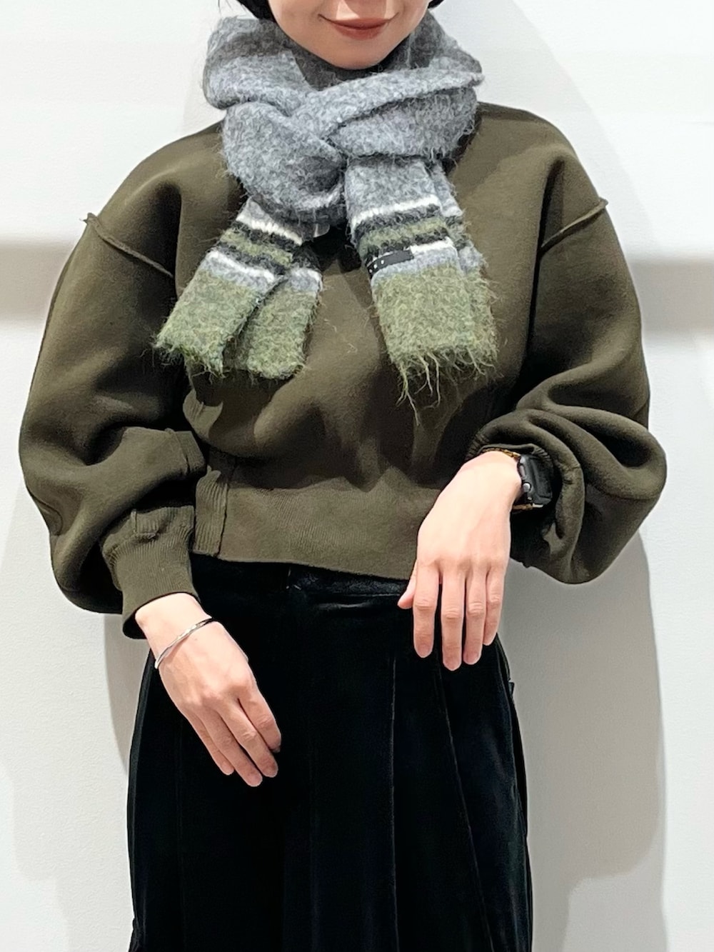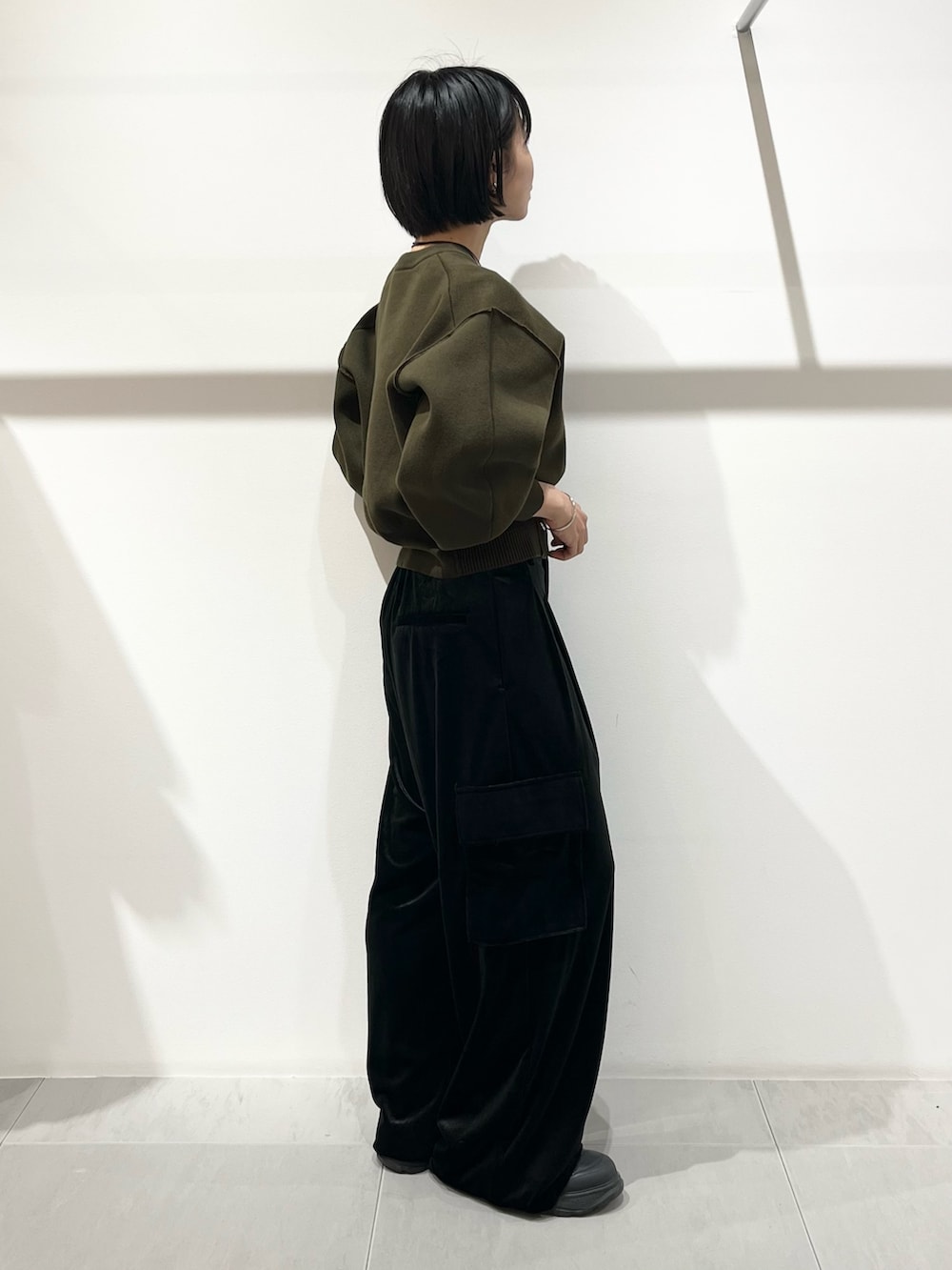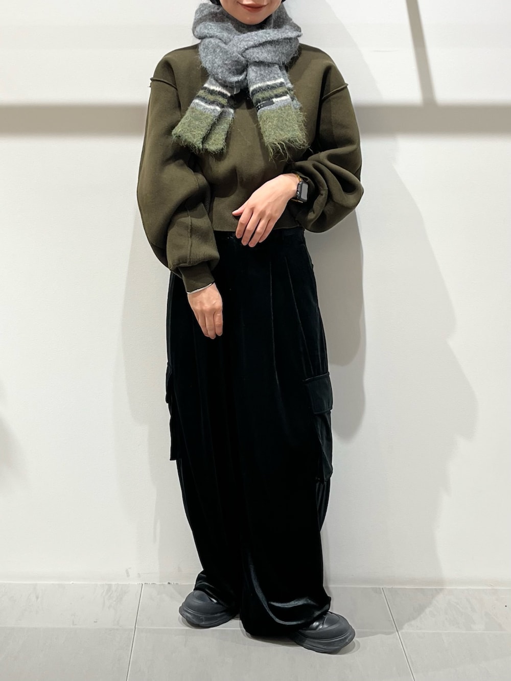スウェット風のニットは目が詰まっており暖かいです!ベロアのボトムは秋らしいけどすっきりした印象になりおすすめです。