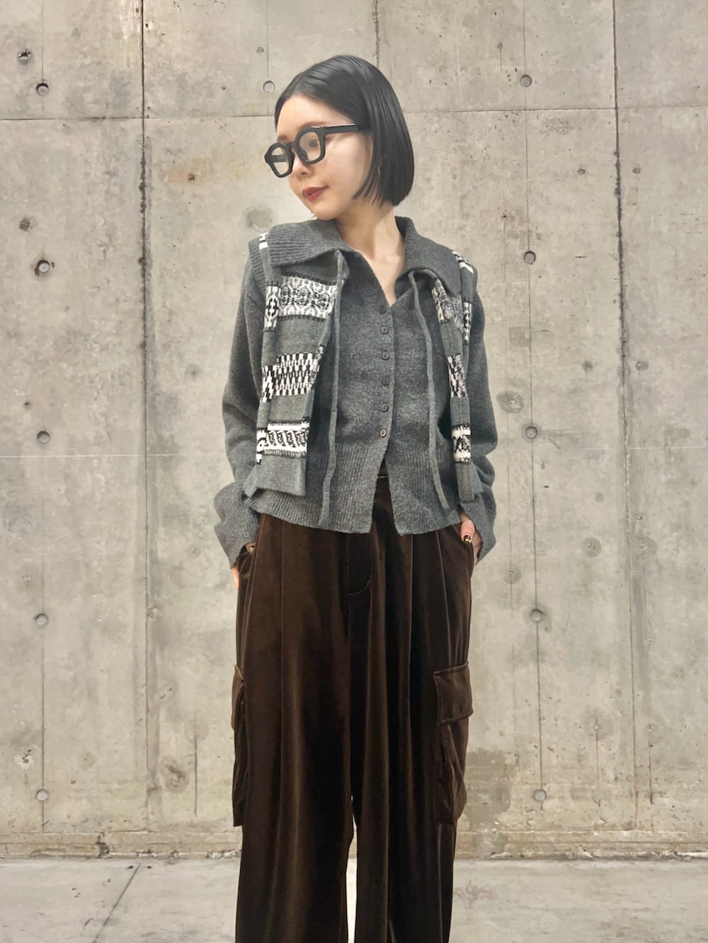 ボトムスはベロア素材のカーゴパンツを合わせてカジュアルスタイリングにしました。