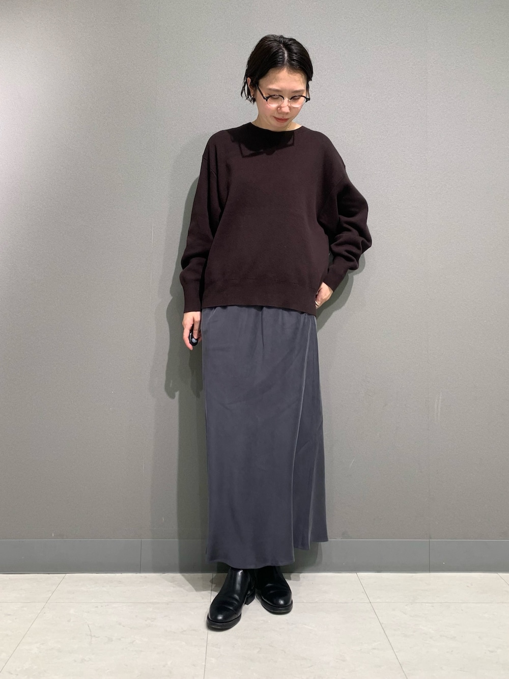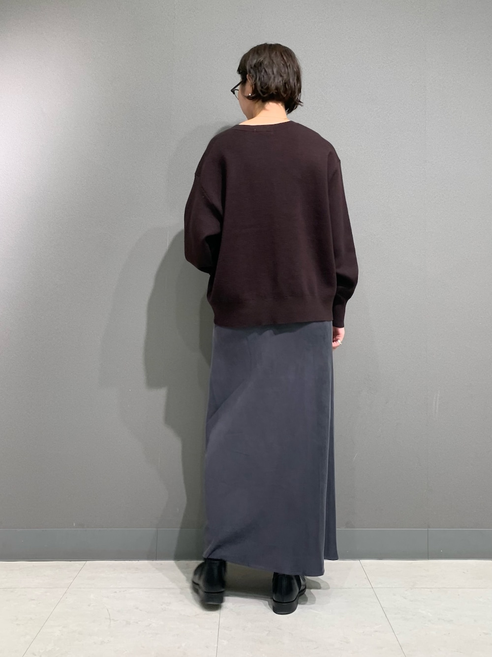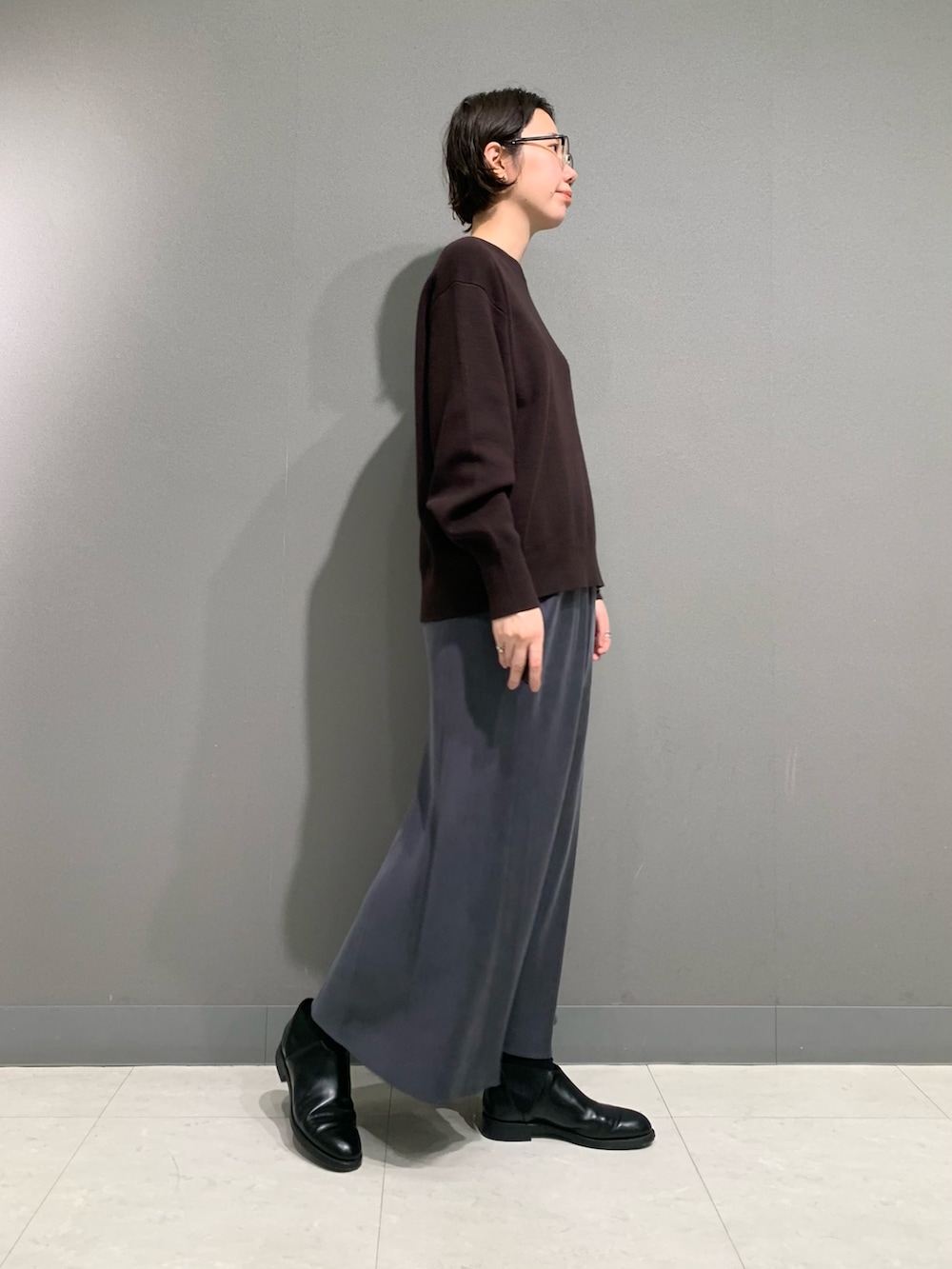 人気のキュプラスカートは少し地が厚くなって再登場しました。薄過ぎないので秋冬のニットやアウターともバランスが取りやすいです。絶妙なチャコールカラーは程よく色を差してくれます。