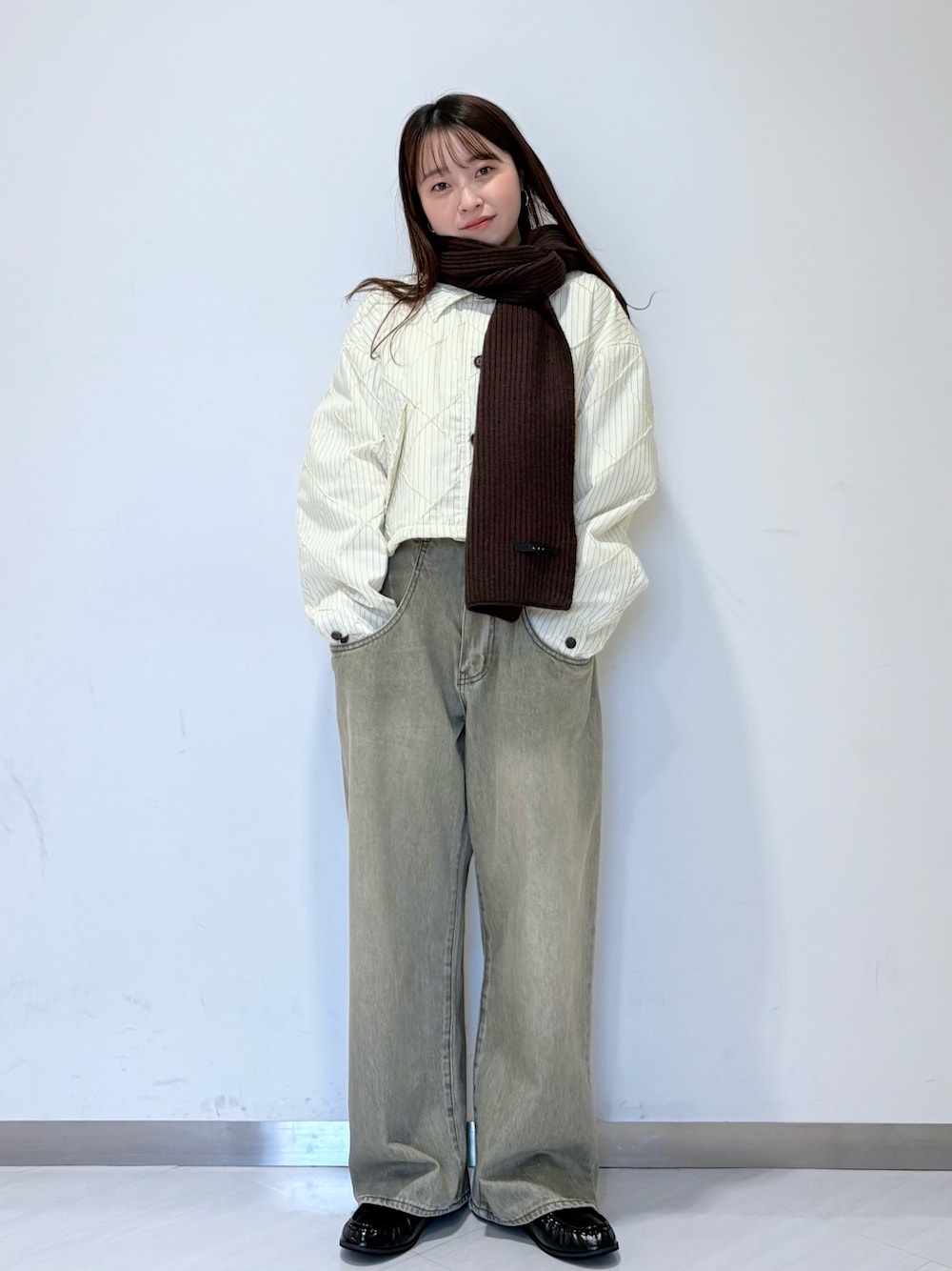 身長152センチで1度ウエストを折り返していますが、シューズ次第では折り返さずとも着ていただけそうです!