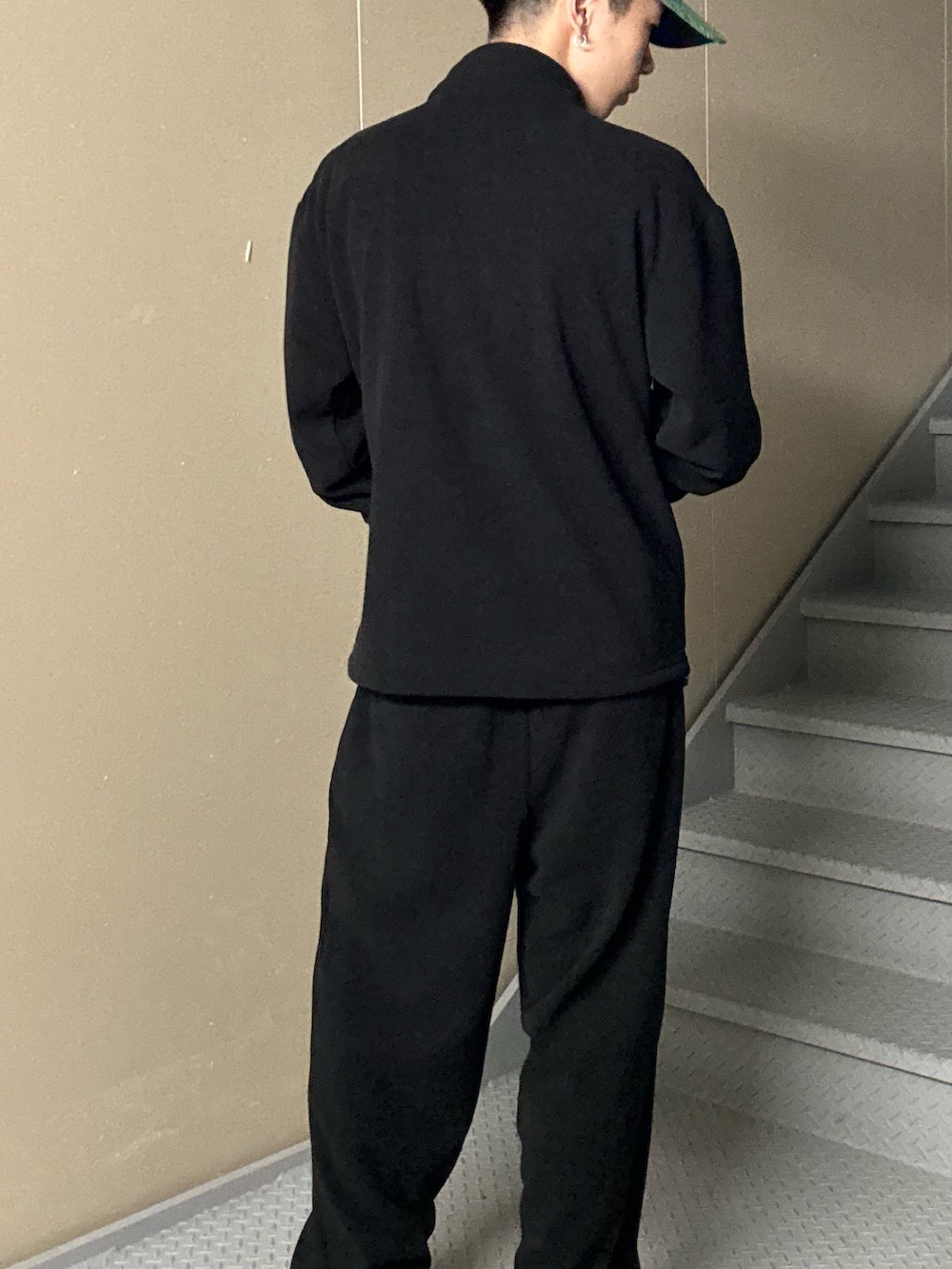 ハーフジップのトップスとワイドパンツでゆるさを出しつつ、モノトーンの落ち着いた印象が全体を引き締めます。