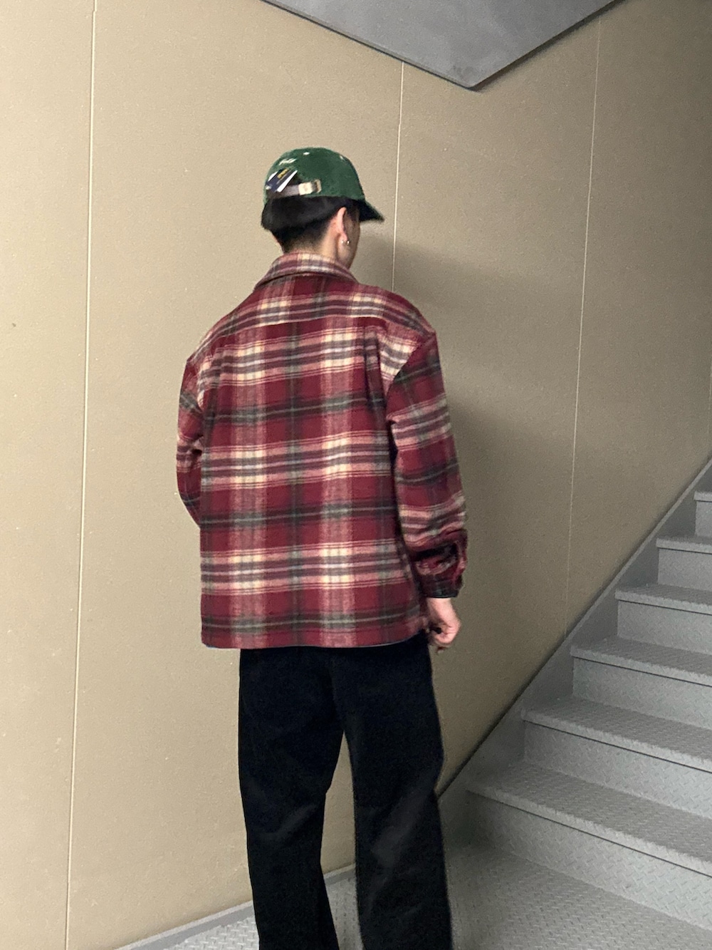 深緑のキャップが全体のトーンに抜け感を与え、落ち着きながらも洒落た印象に。