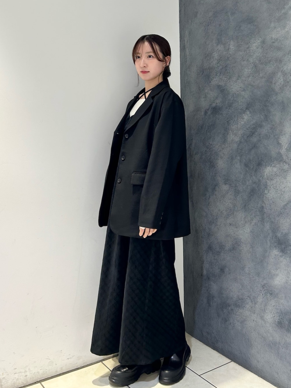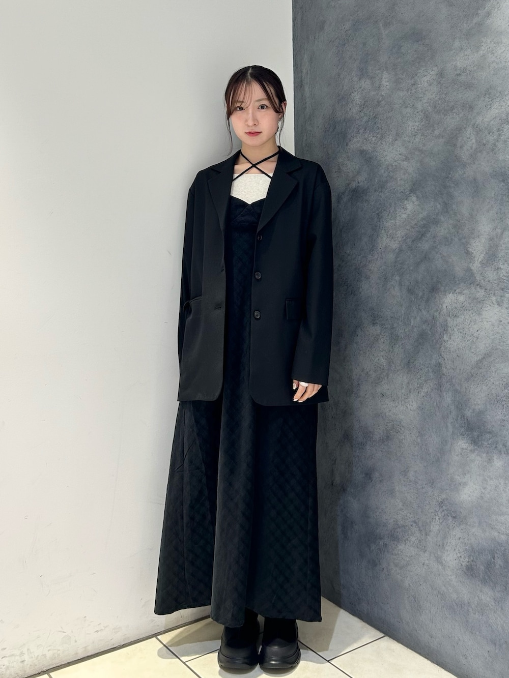 ワンピースのシルエットがすっきりなのでジャケットと合わせてもバランスがとりやすいです🎶