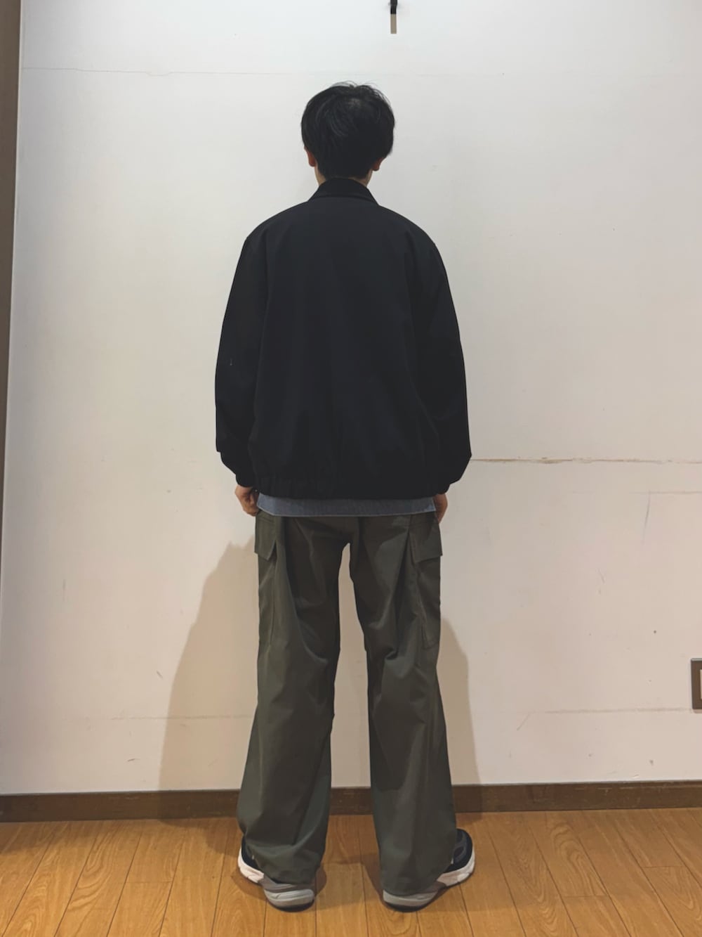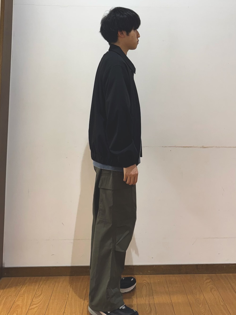 カットデニムのインナーにカーキのパンツを組み合わせました。色のまとまりが欲しかったので、黒のブルゾンを組み合わせて落ち着いた感じを演出しております!