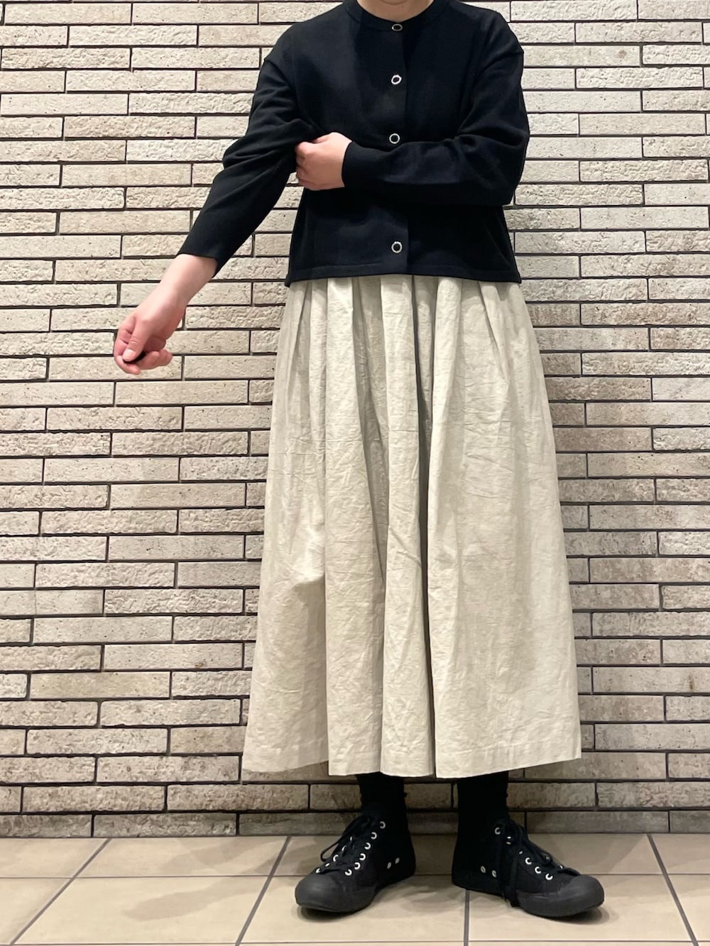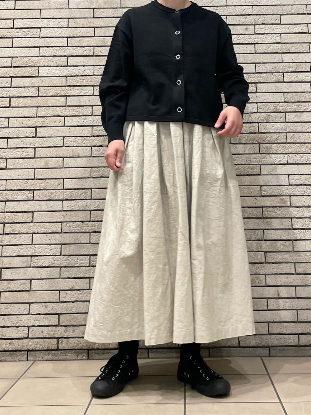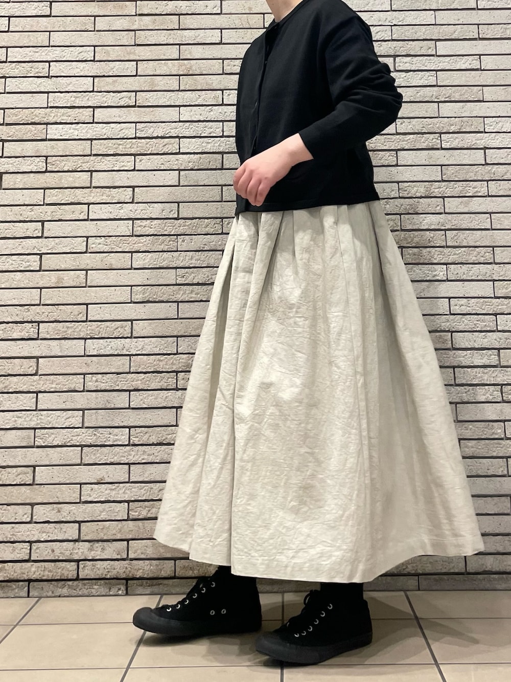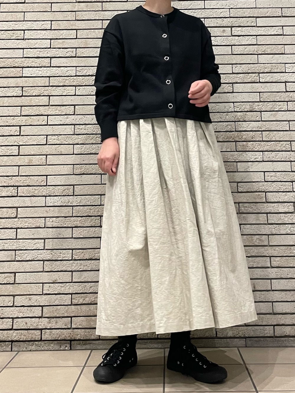 ゆったりとしたスリーブにスッキリとしたショート丈はワイドパンツやロングスカートとも相性◎今回はボリュームのあるスカートでモノトーンコーデです。