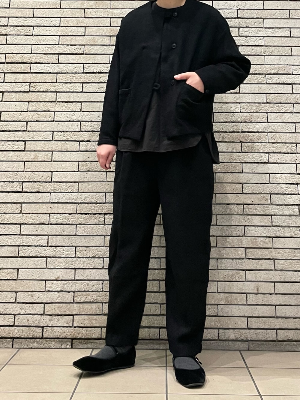 同素材のパンツとセットアップが可能ですので、フォーマルシーンにも着用いただけます。パンツはウエストがゴム仕様で着用しやすいです。