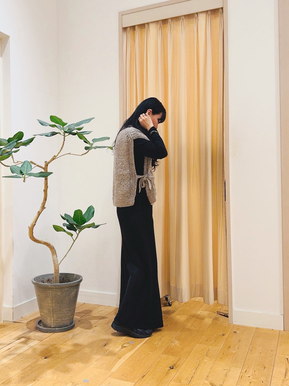 色も染めておらず天然の色味なので風合いがとても良いです。脇周りは広く開いていますのでお好きなトップスをレイヤードしたりワンピの上に等幅広く使っていただけます!アウターも着れますので今から長い期間楽しめます♡