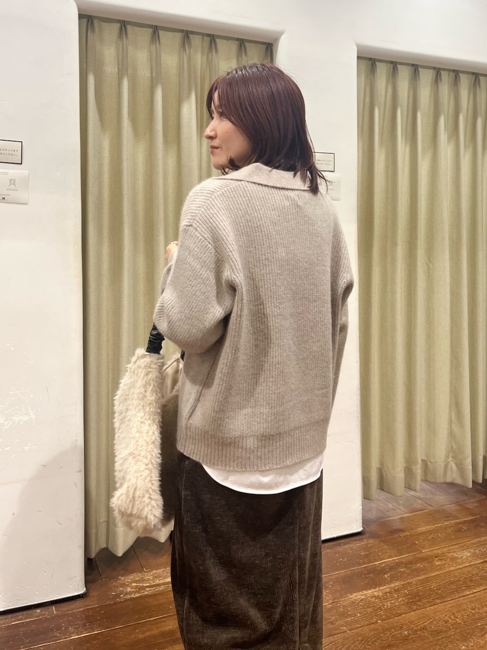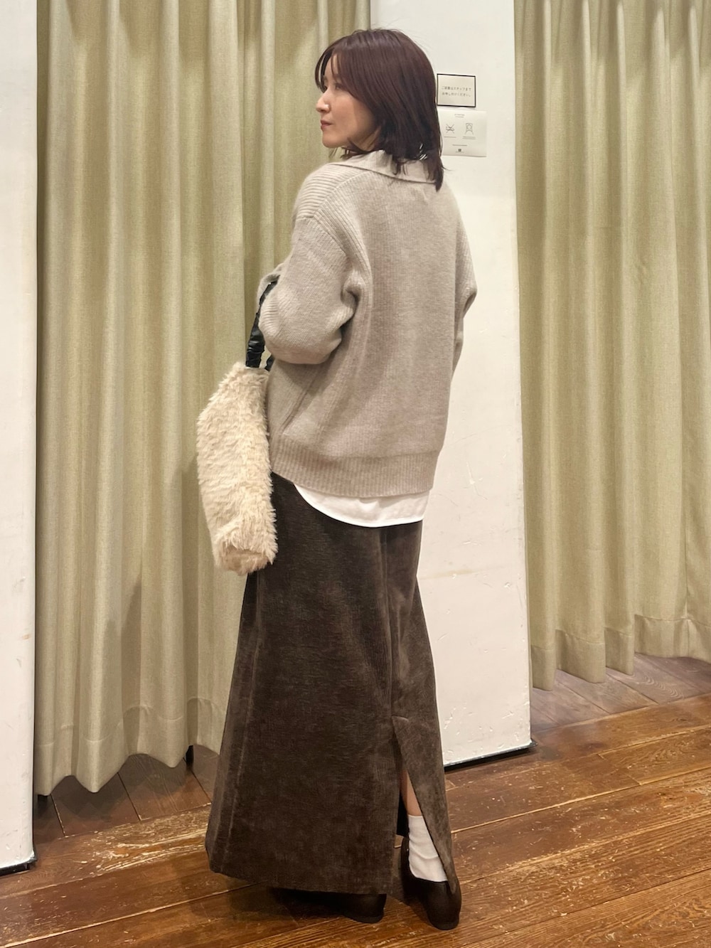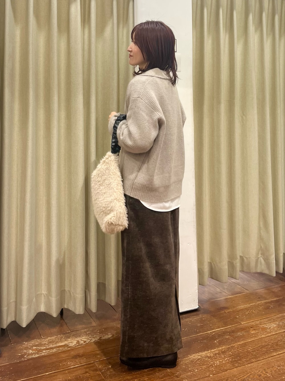 合わせたスカートはベロア素材で生地もしっかりしたいるので寒くなる時期でも着ていただきやすいです。ストレッチも聞いていて後ろにスリットが入っているので足捌きもしやすいです!