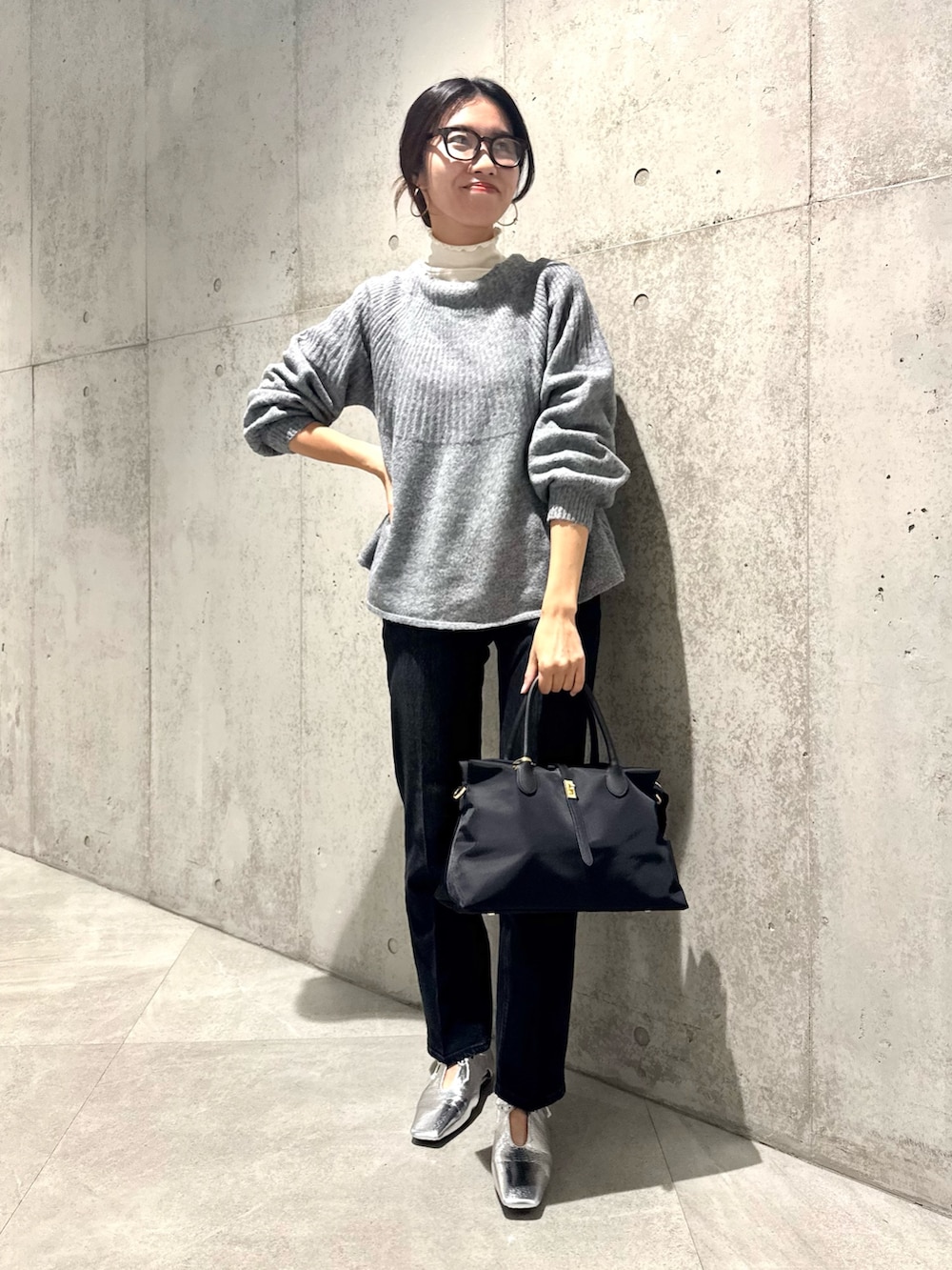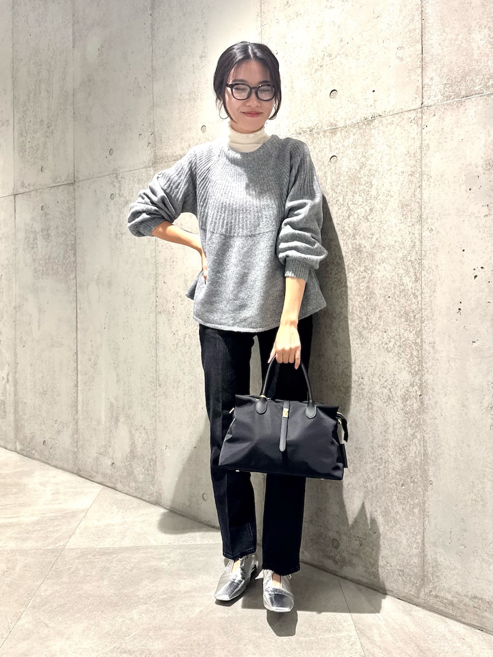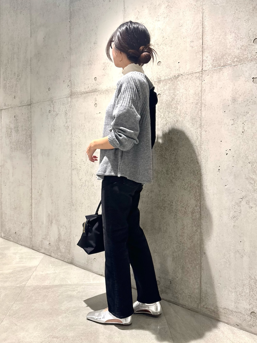 存在感のあるニットのボトムスには、細身なブラックデニム合わせできれいめに。