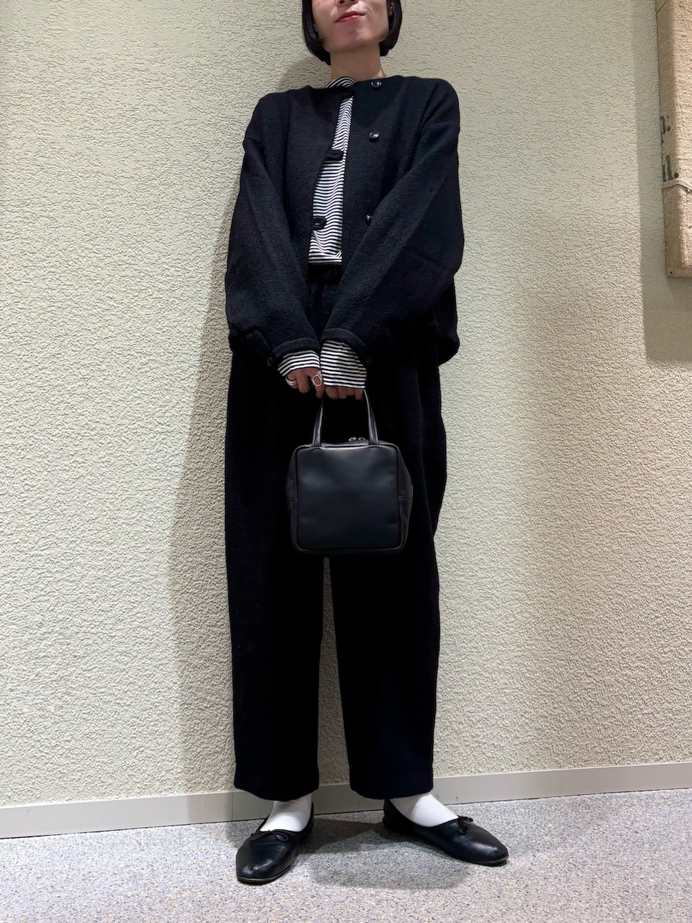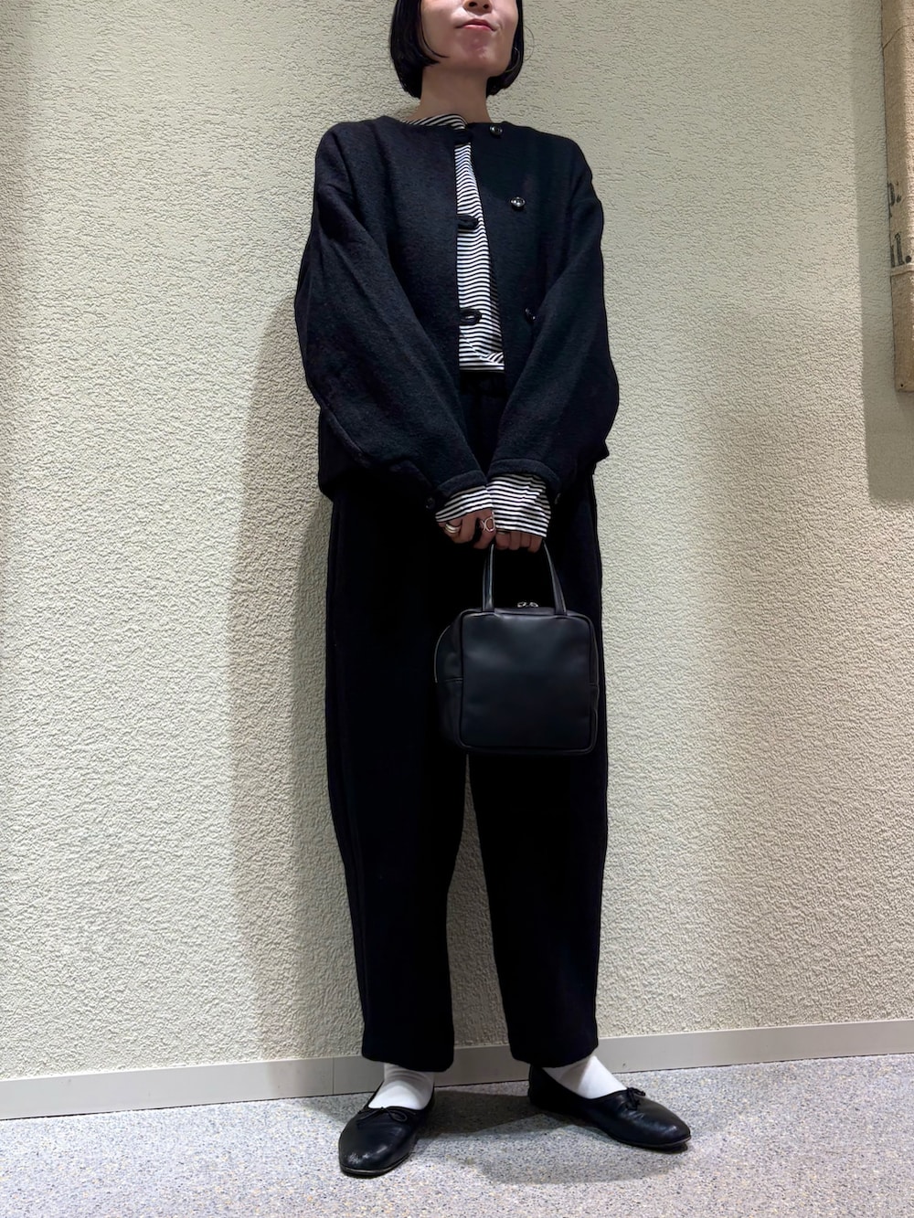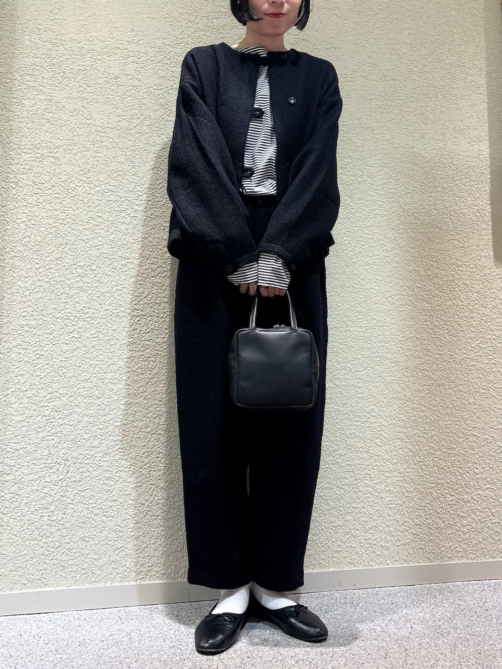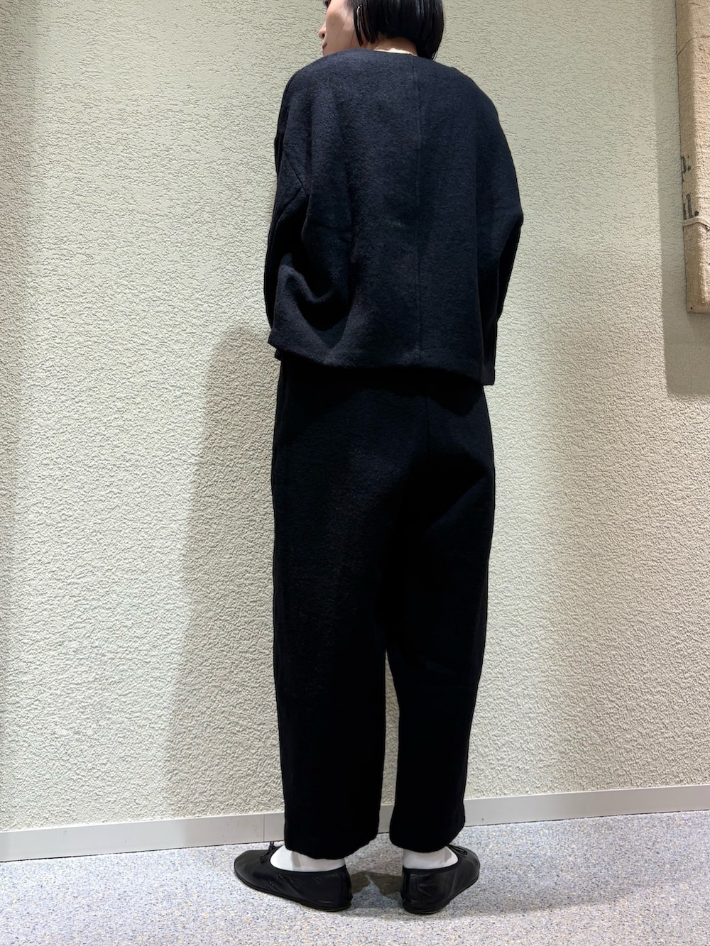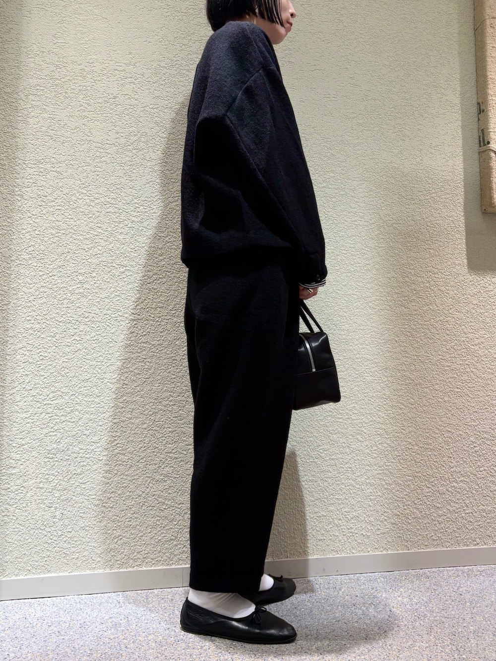 BLACKのカラーは同素材のパンツもお作りしているので、このようにセットアップであわせて着るのもオススメです。