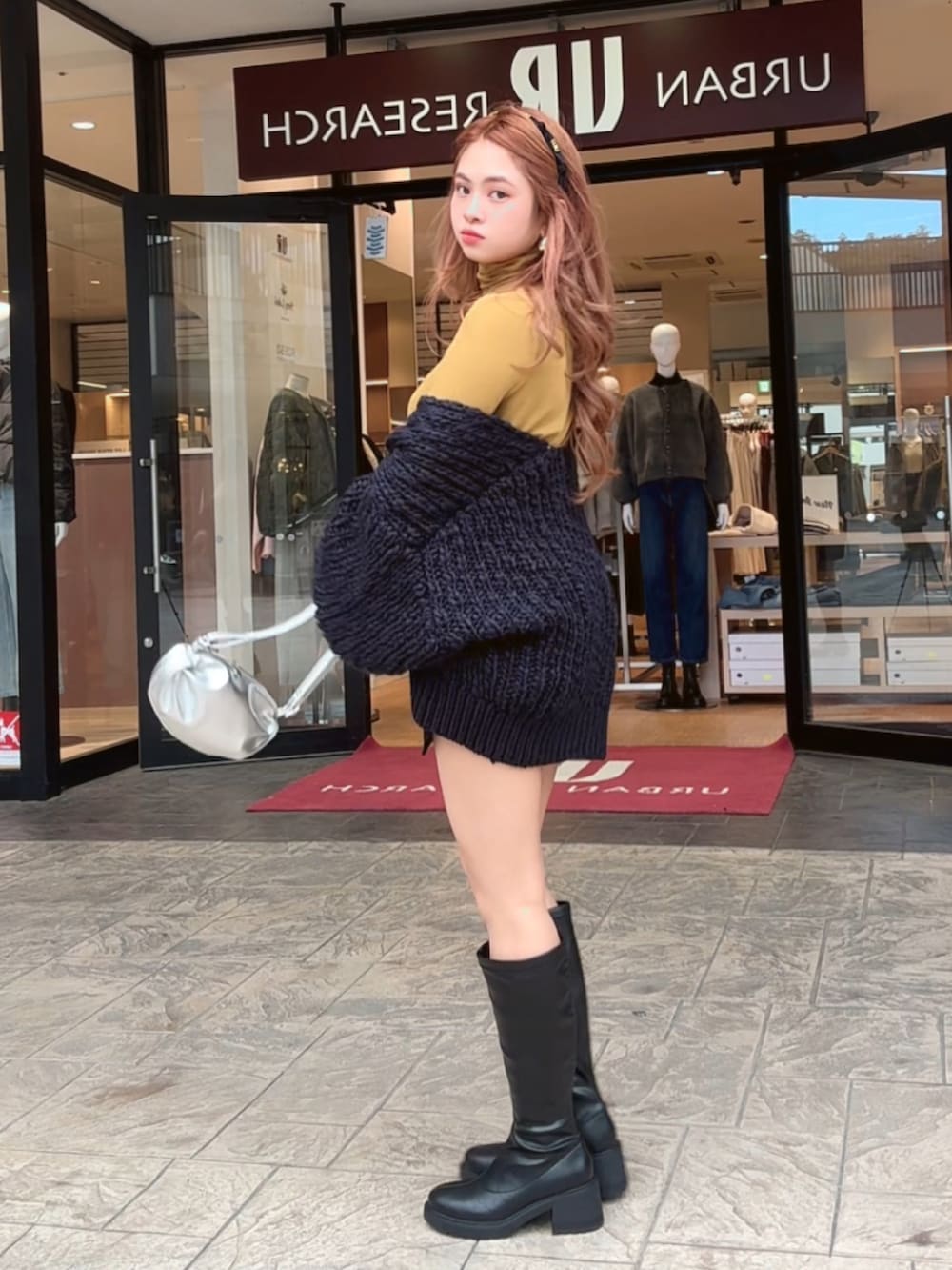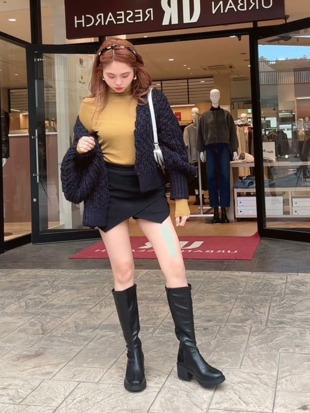 ミニスカートとロングブーツを合わせることで、冬でもスタイルアップ&脚長効果を演出。