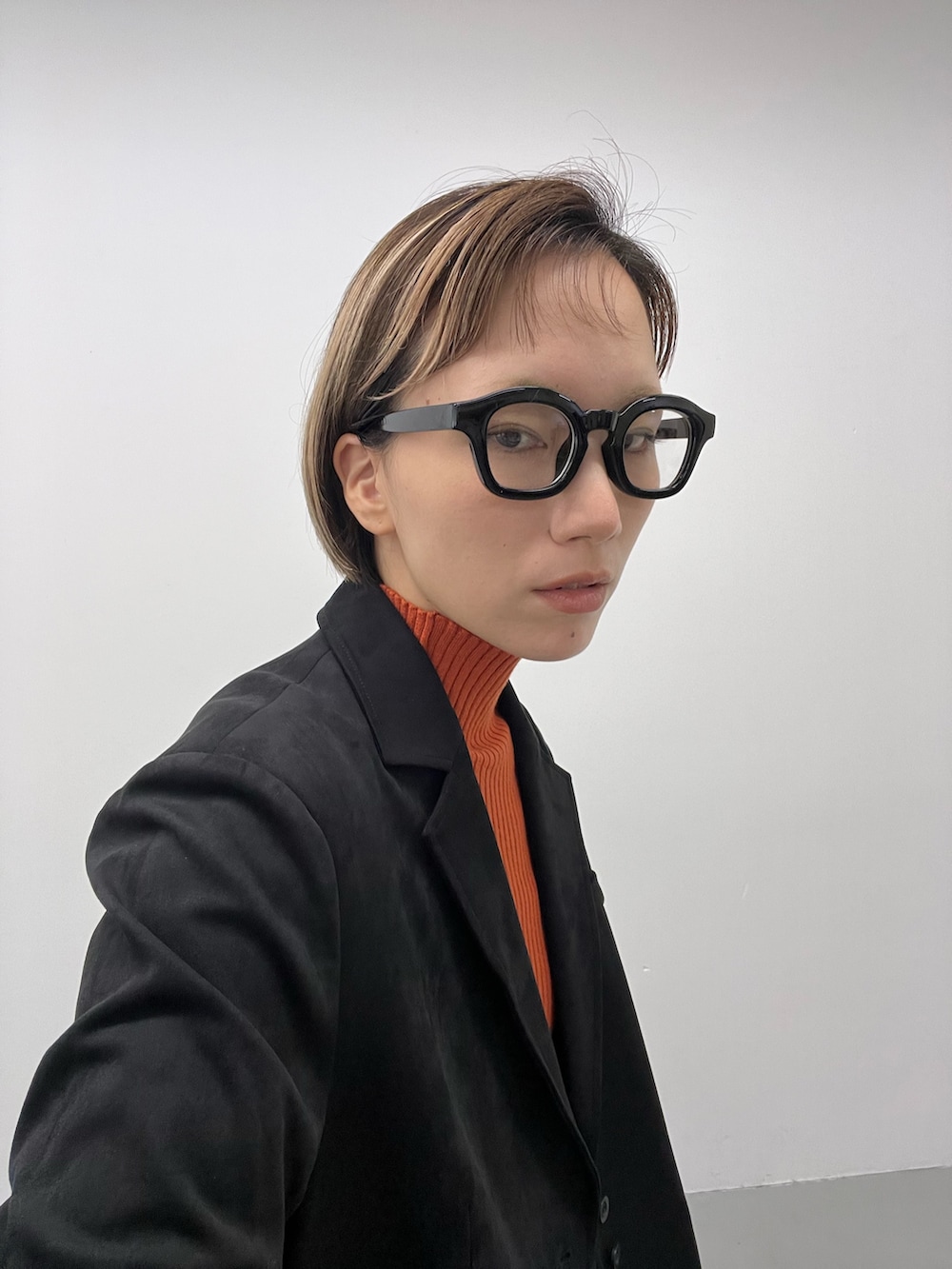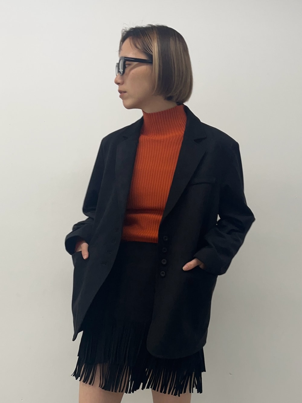 トップスには目を惹くカラーのコンパクトニットを選びました◯