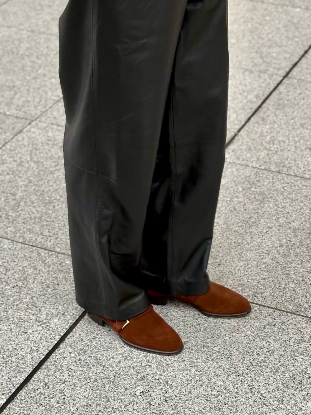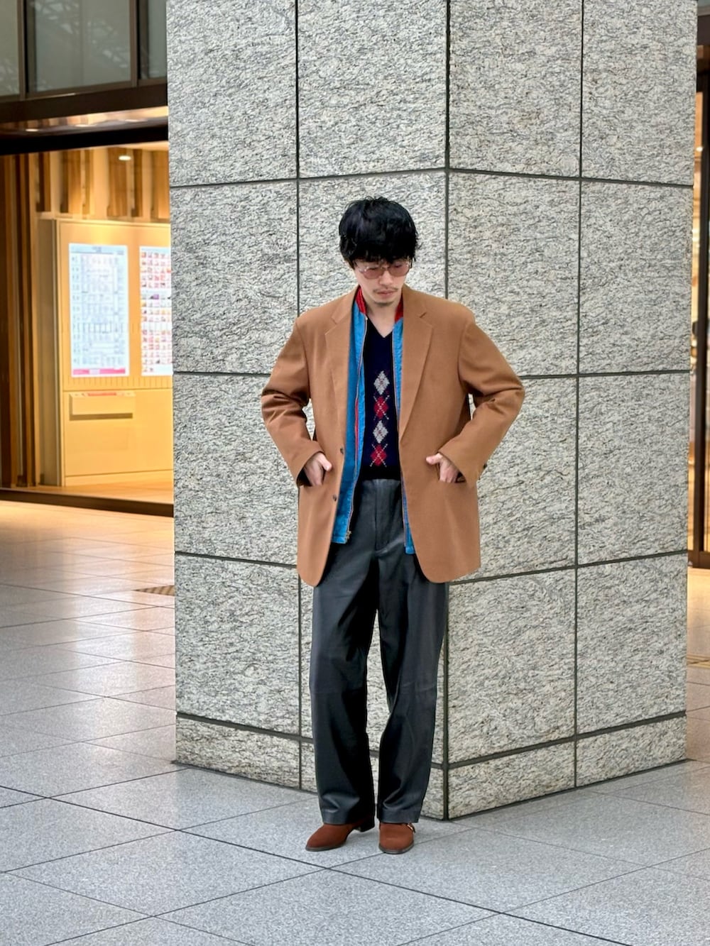 ダック生地のテーラードジャケットにレザパン。ダブルニー。イギリス製のニットをインナーに入れつつムードは高めながら、多国籍なユッカスでまとめる。インナーに気持ち見えるようにフレンチスポーツジャケでアクセント。