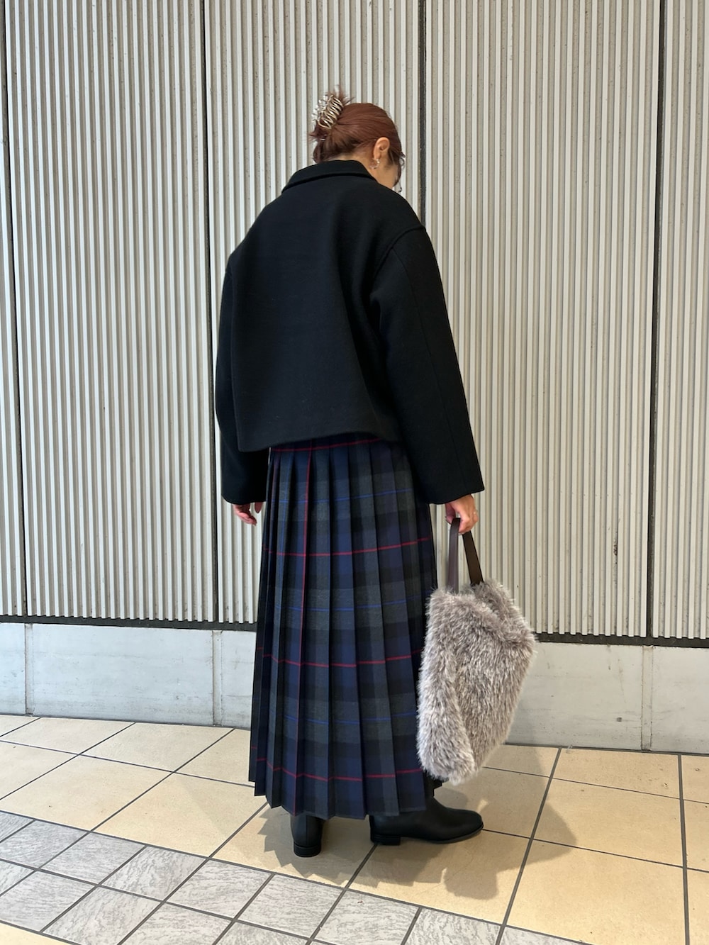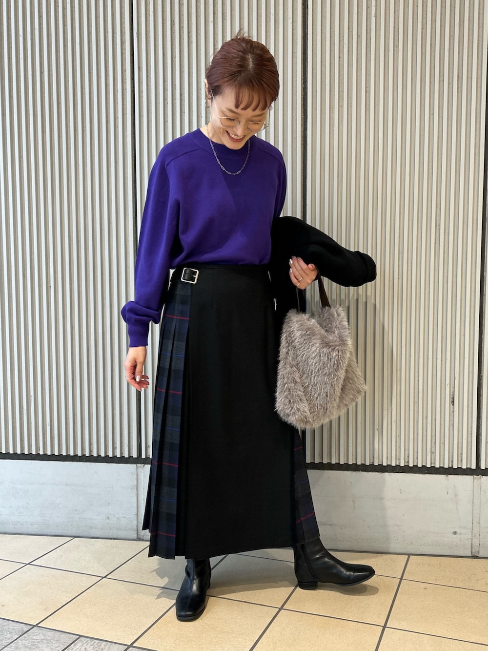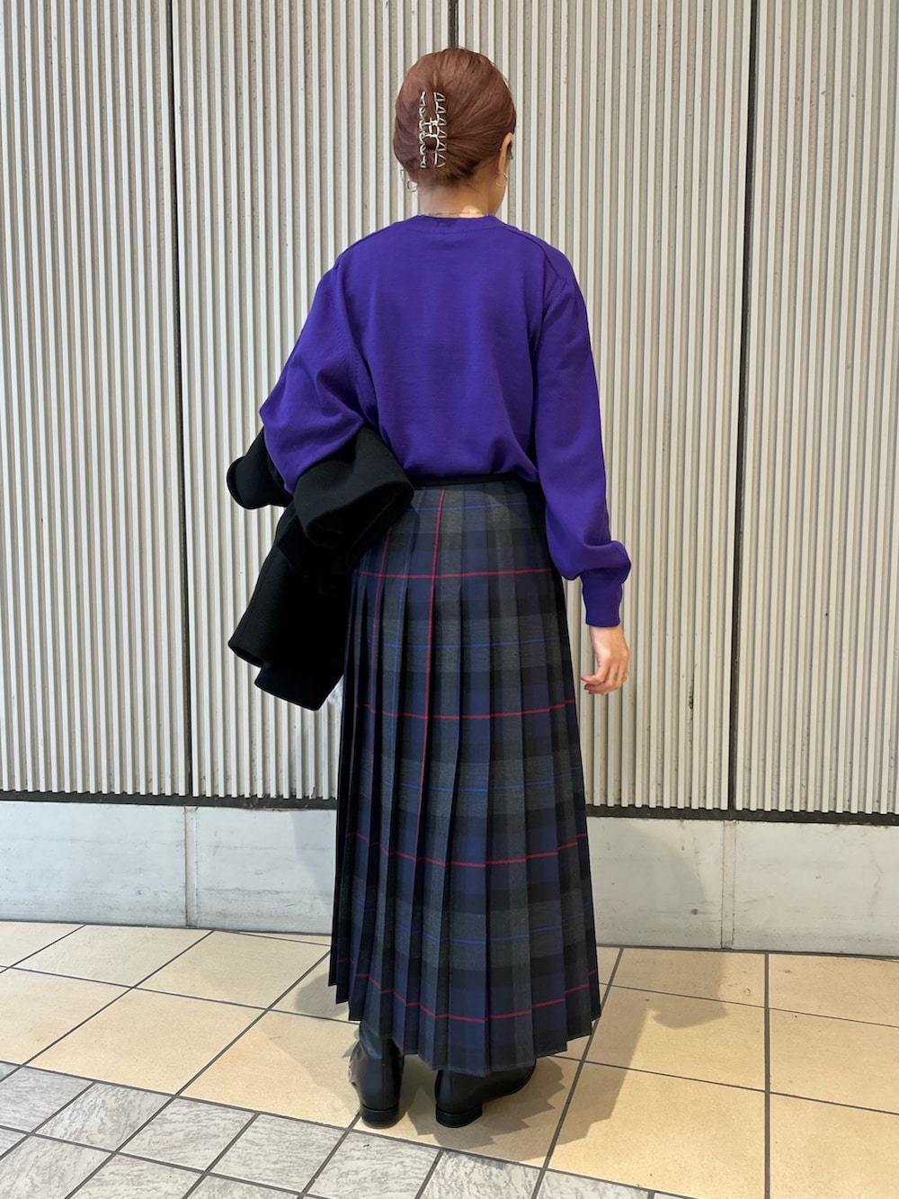 目を引くパープルニットをメインに、ONEIL OF DUBLIN✖️DOORS別注のキルトスカートを合わせてみました。