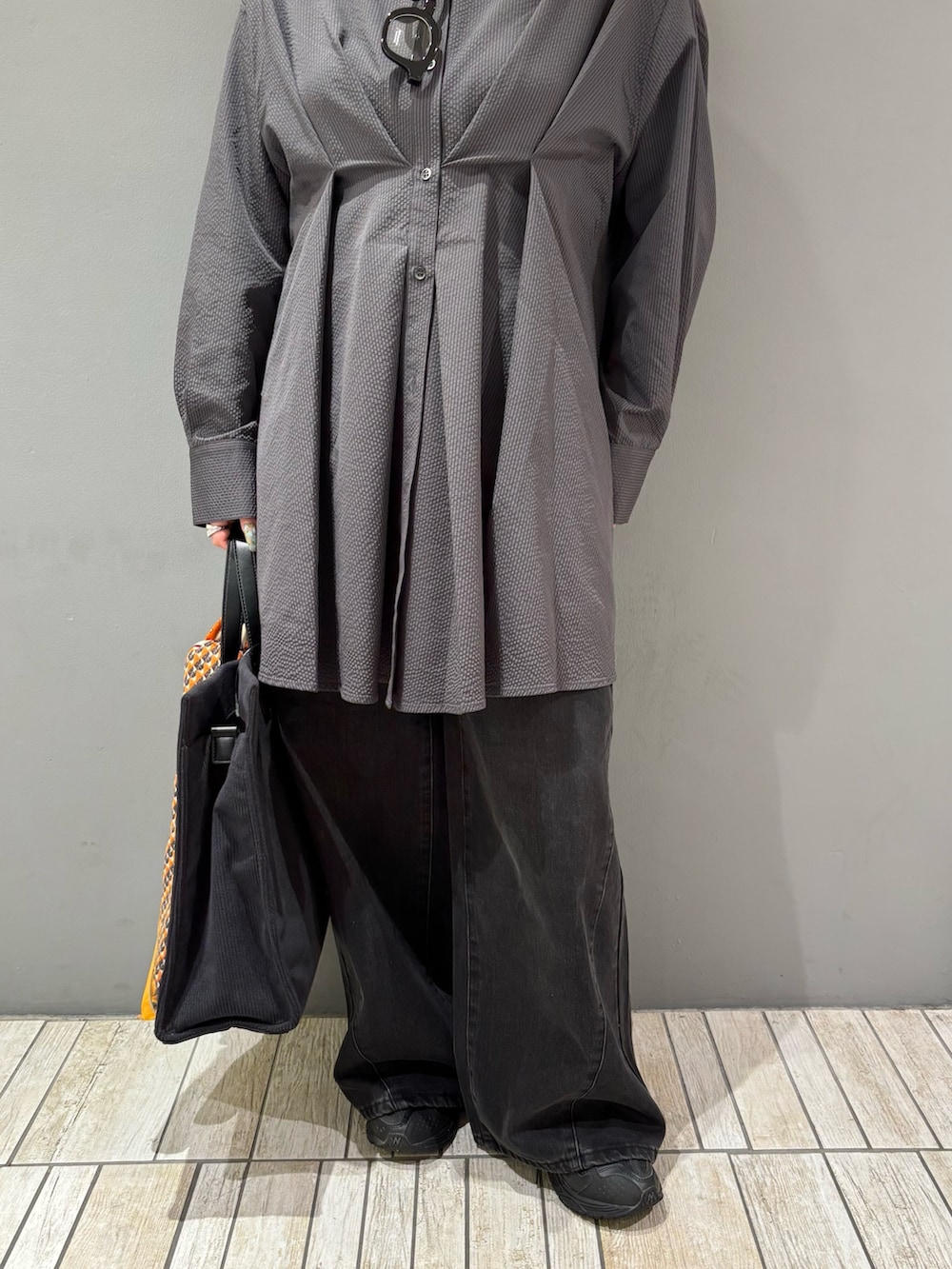 着てみた感じ、ゆとりのあるサイズ感ですが上半身が大きく見えることもなく、ウエストに入ったタッグが細見え効果ありでした!後ろのシルエットが若干大きく見えるかなと思いますが、これからの時期はアウターでカバーできるので大丈夫ですദ്ദി ῀ᢦ῀ )
