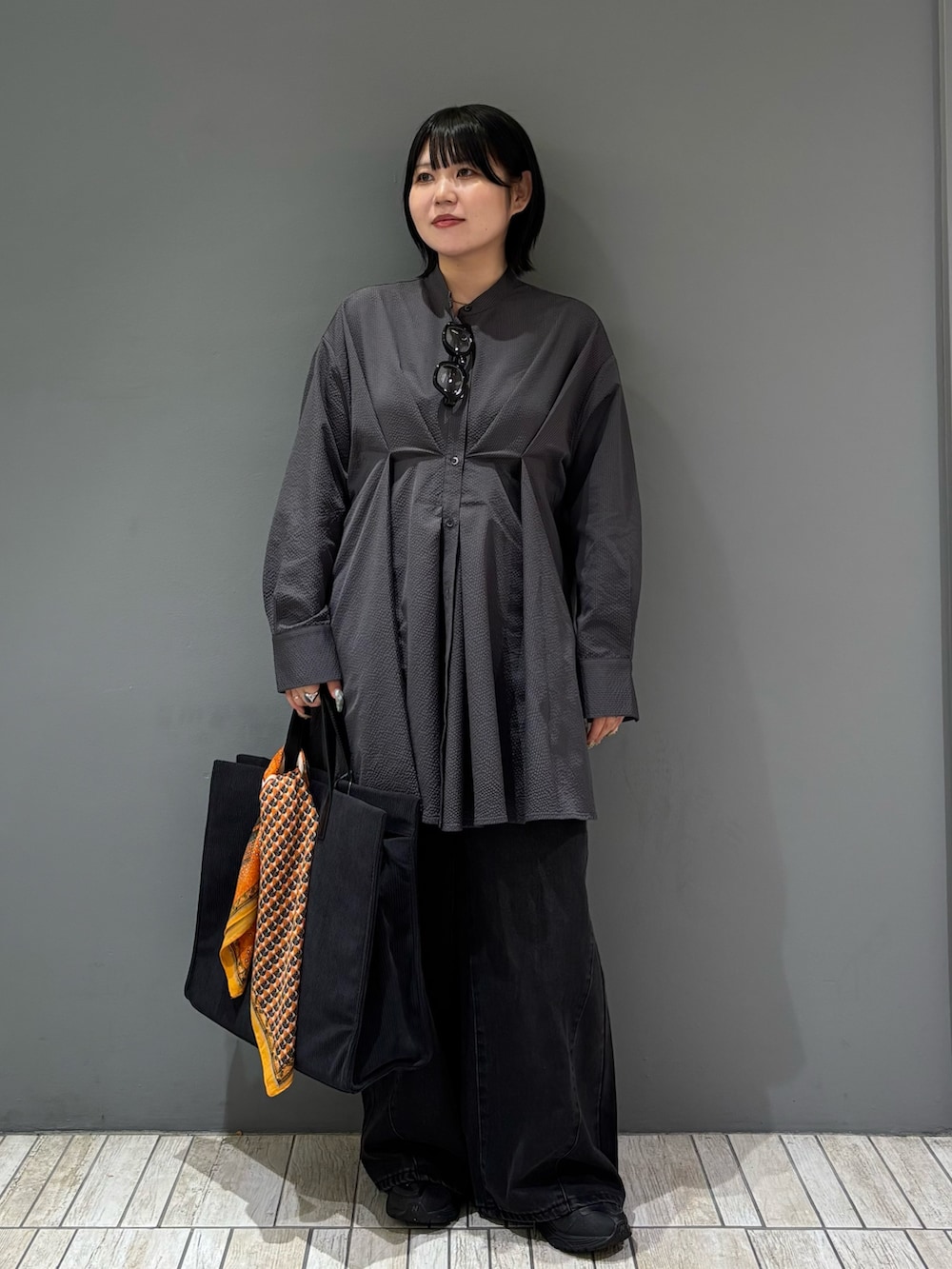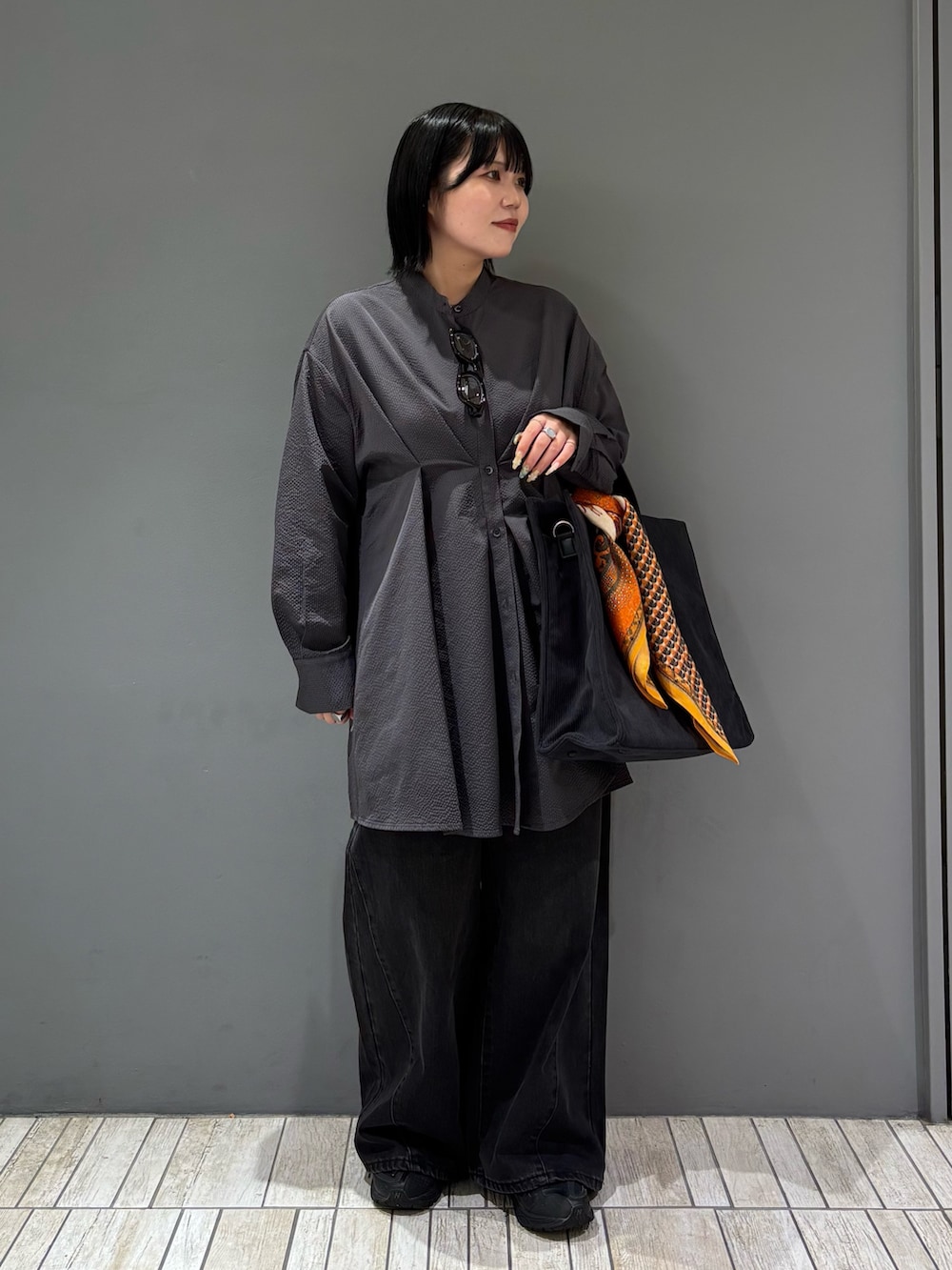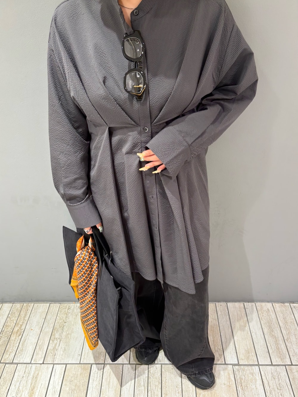 ・モノトーンでのっぺりしないようにバッグにスカーフを巻いてアクセントに.ᐟ.ᐟ.ᐟ