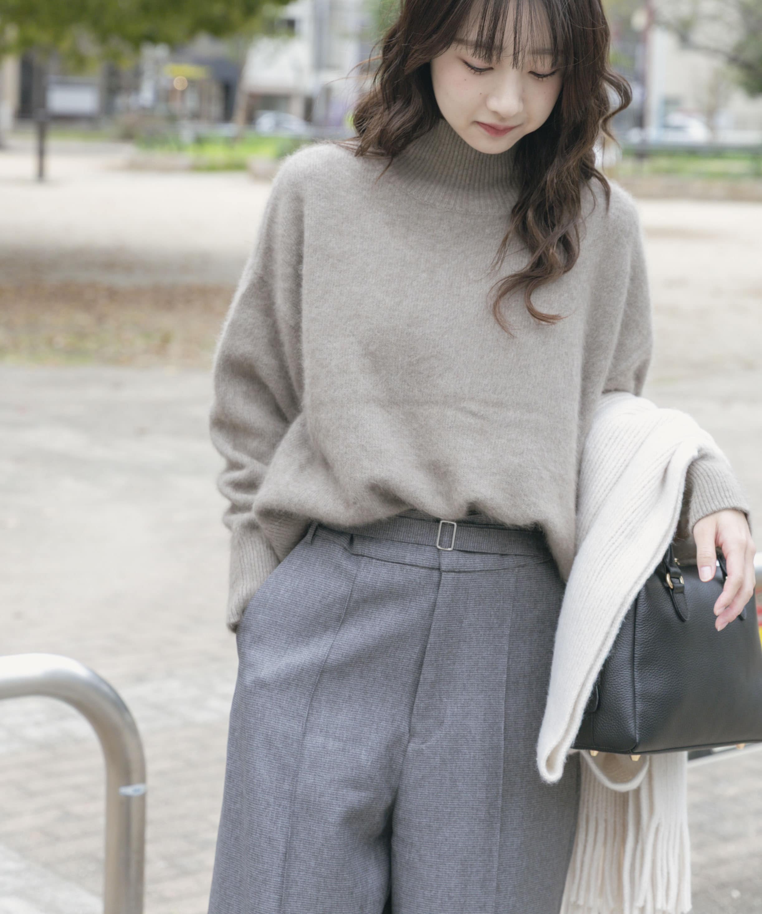 たぬき毛を使用したハイネックニットに、ショートパンツとブーツを合わせた大人かわいい冬コーデ。
