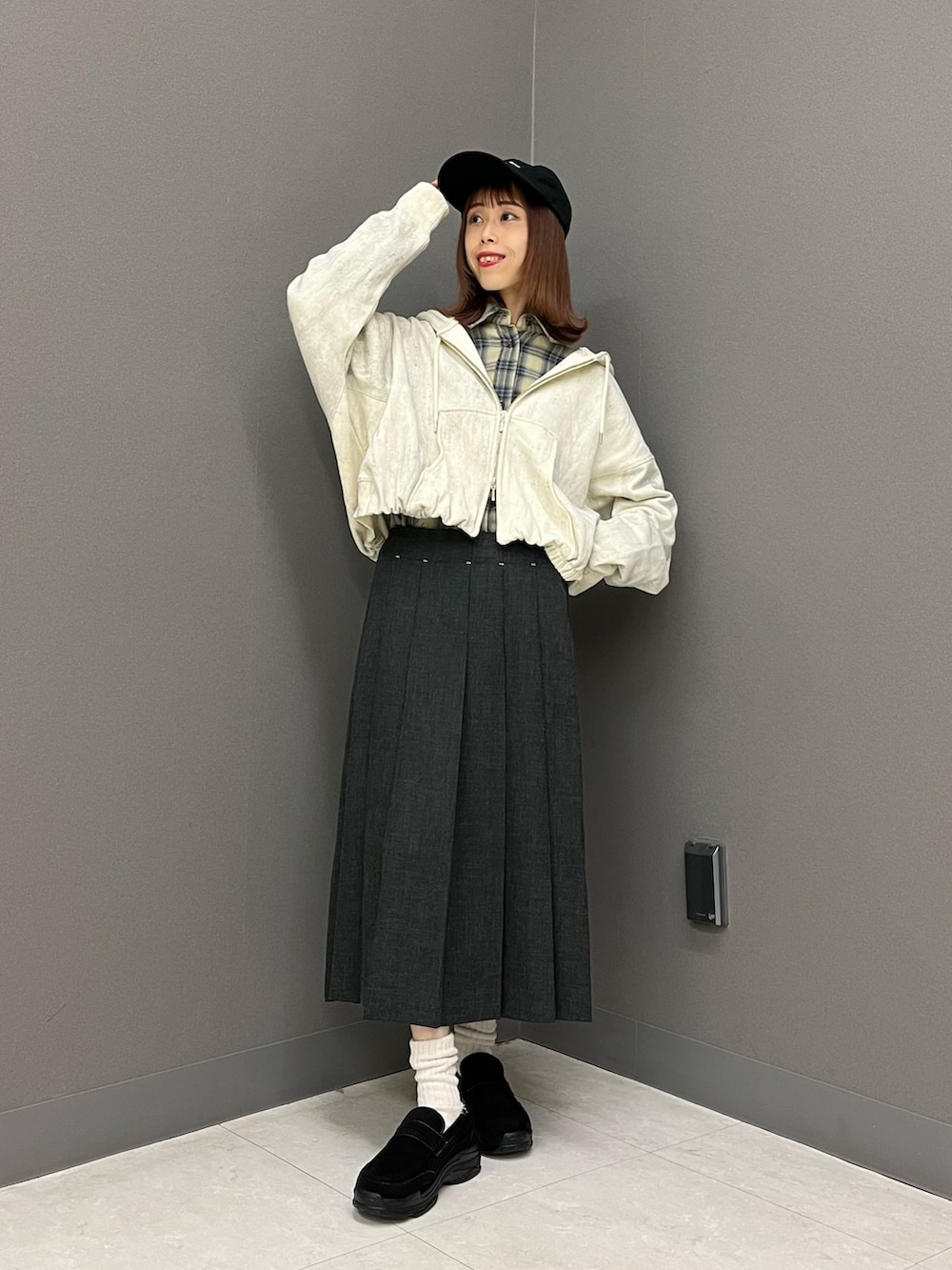 チェックシャツ×プリーツスカート×ローファーのかっちりスクール風コーデにあえてキャップとパーカーを合わせて外してみました🫰🏻