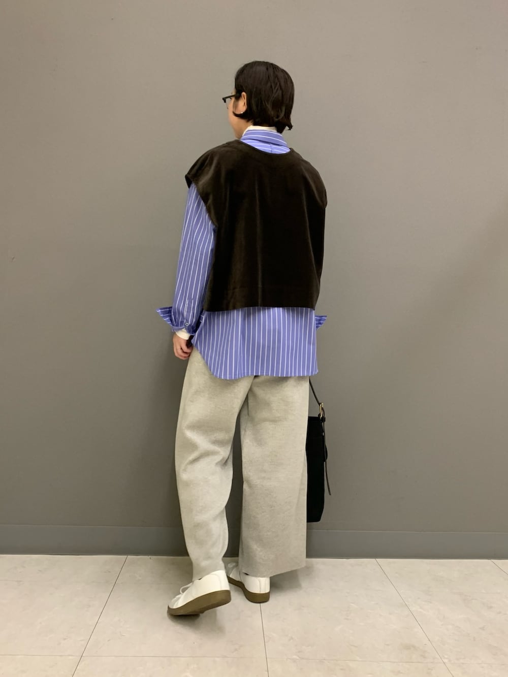 鮮やかなブルーが素敵なストライプシャツ。丈は少し長めでベストやニットの下にレイヤードするのにも使いやすいです。