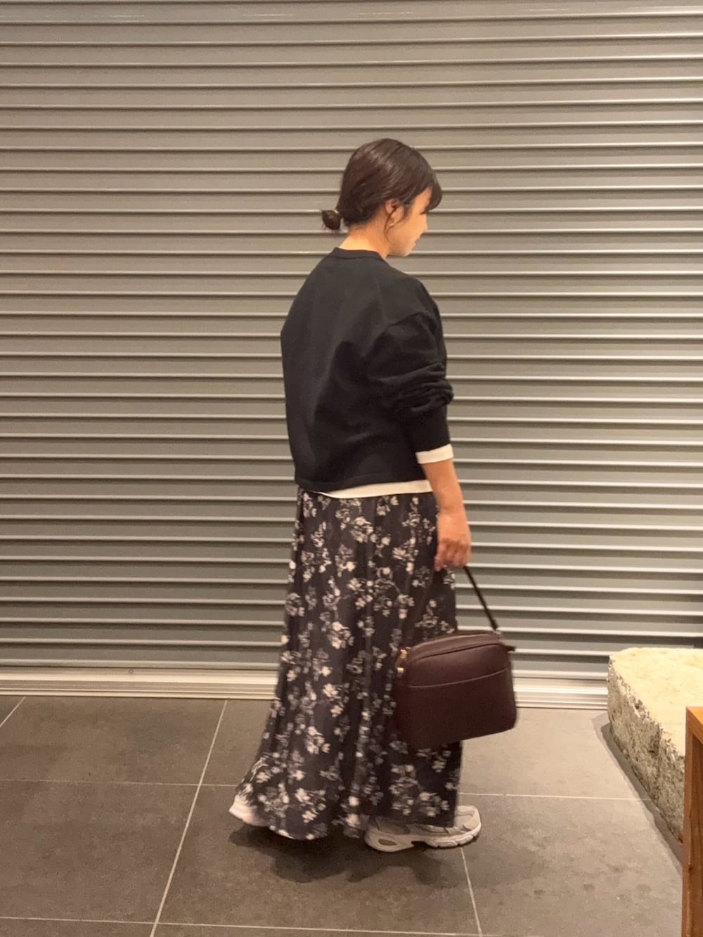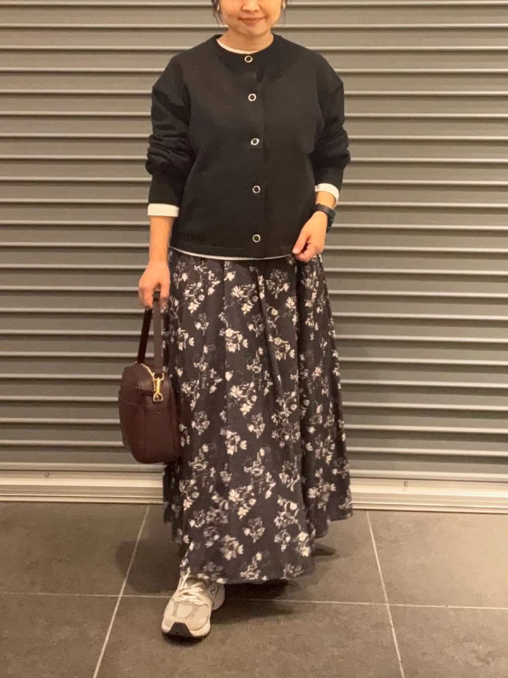 スカートはベロア素材でフラワープリントがキレイ見えします。ウエストは総ゴムなので楽ちんです。バックで秋カラーをプラスしたコーデにしました。