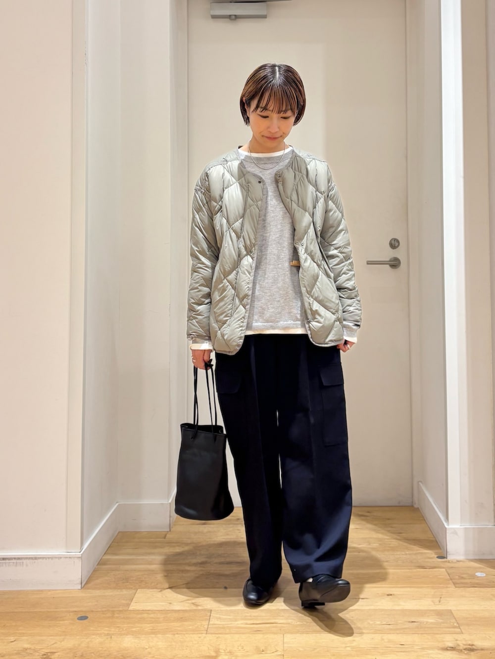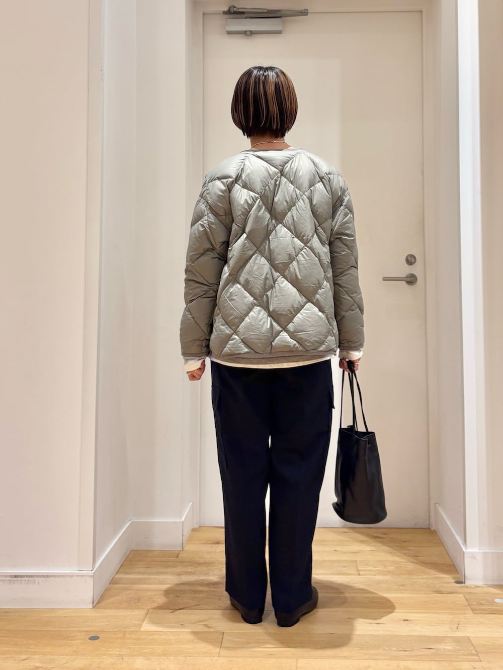 ノーカラーなので、タートルネックやフードアイテムとの相性も抜群ですよ◎