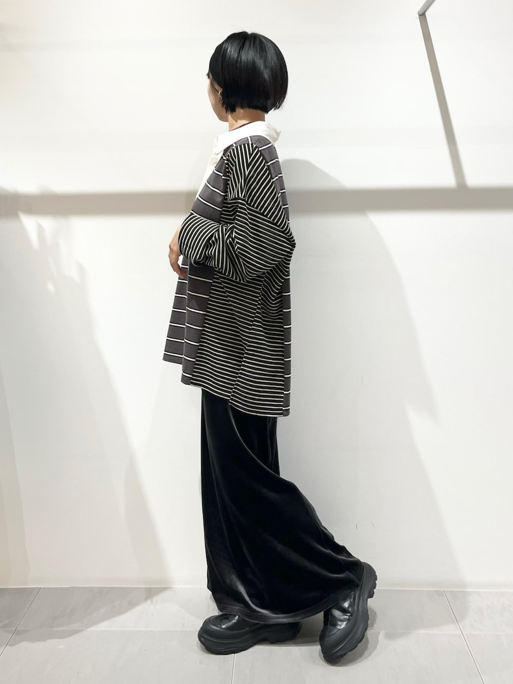 ゆったりしたポロは気楽に可愛く着られます。カジュアルアイテムなのでベロアスカートで大人っぽく合わせました。