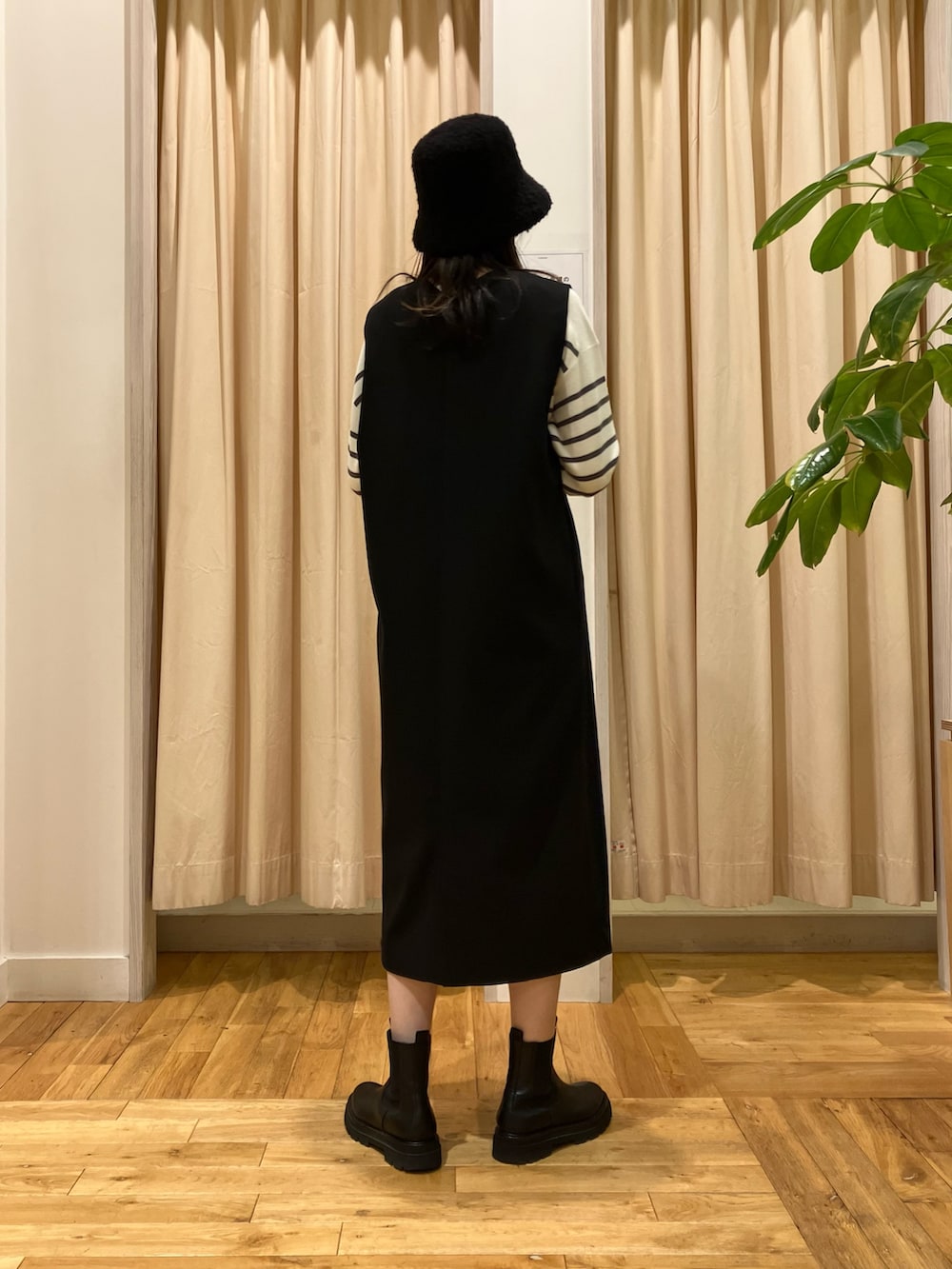 きれいめなジャンパースカートは冬も過ごせる厚手の素材、さらに嬉しい発熱機能付き。2サイズなので幅広い身長の方に着ていただけます◎